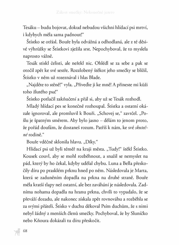 Štístko a jeho smečka se dokázali ubránit Běsovi, nelítostnému vůdci cizí tlupy. Přesto nejsou v bezpečí. Jezero, ke kterému doputovali, se zdá být nekonečné a nelze v něm ulovit žádnou kořist. Zima se blíží a smečka prahne po jídle a suchém přístřeší. Alfa všem dává najevo, že jeho vlastní potřeby jsou nadřazené potřebám ostatních. A hlídací psi jim jsou v patách…