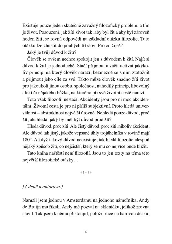 Tento soubor 26 textů má jediný úkol: zkoumat lidskou honbu za čistotou. Kniha vypráví o muži, který je posedlý touhou nalezení ideálu čistého života. Zkoumá jeho životní cestu plnou nadějí, frustrací a mudrování. Do tohoto úkolu zapojuje velkou škálu stylů – od povídek z cest a barů přes impresionistické eseje až k sokratovským dialogům. Kniha pro všechny, kteří mají zájem o filosofické úvahy a introspektivní cestu k pochopení lidské snahy o čistý život.