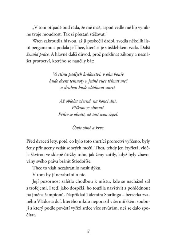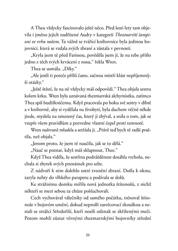 Althea Zoltaire ví, kdy zemře. Proroctví jí dalo přesně tři roky. Tři roky na to, aby se stala tím, čím vždy toužila být – válečnickou legendou. Teď přišel čas ukázat, že patří do elitního cechu, který chrání pět království. Výcvik je nelítostný, jenže to není to jediné, co Altheu ohrožuje. Je tu i Wilder Hawthorne, tajemný válečník, který jí s každým pohledem zamotává mysl víc, než by se jí líbilo. Přežije Althea zasvěcovací zkoušku a stane se šampionkou Thezmarru, nebo prohraje nelítostný souboj s časem?