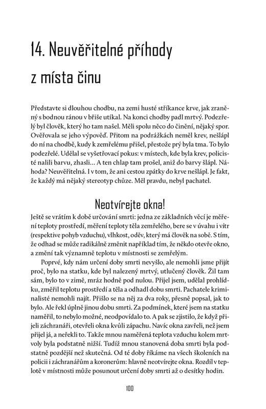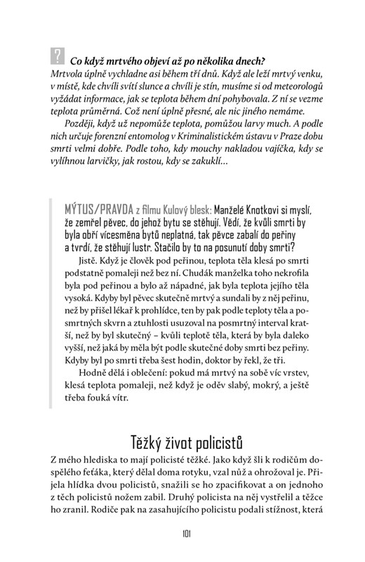 V publikaci najdete nejen vyprávění z každodenní praxe na pitevně, ale i rozhovor o jeho životě, názorech a postojích. Jestli patříte k milovníkům detektivek a kriminálek, je pro vás tato kniha must have. Pokud ne, dozvíte se v ní mnoho zajímavého z oboru, o kterém se příliš nemluví.