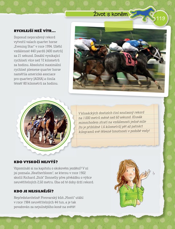 Jsi-li opravdový fanoušek koní, pak je tato kniha přesně pro tebe! Najdeš v ní všechny důležité informace týkající se koní, jejich chovu a anatomie, potřebného vybavení, vhodné péče a ještě mnoho dalšího. Kniha ti odpoví na spoustu otázek počínaje tvou první jezdeckou hodinou až po případnou účast na závodech. Tak neváhej a vstup do světa koní a poníků!