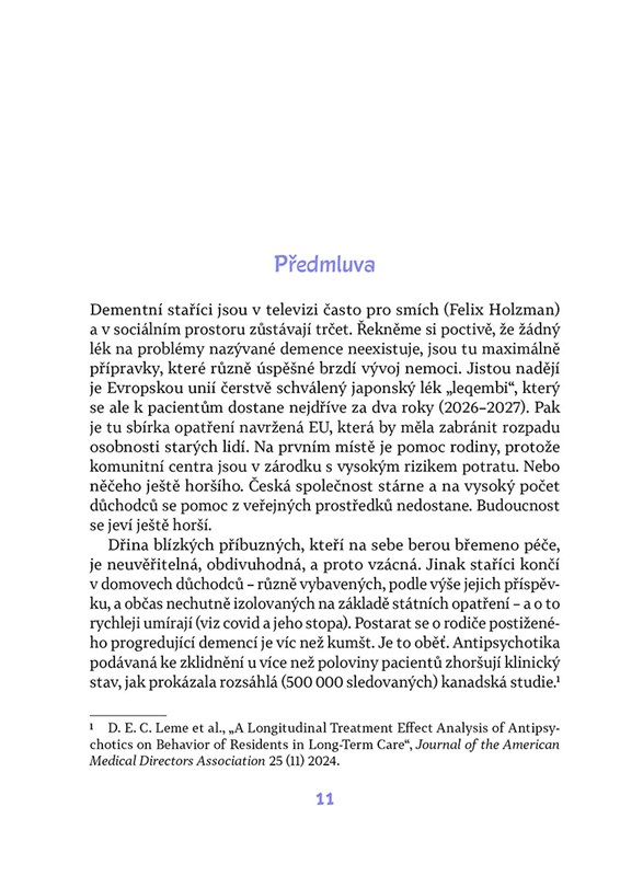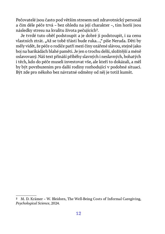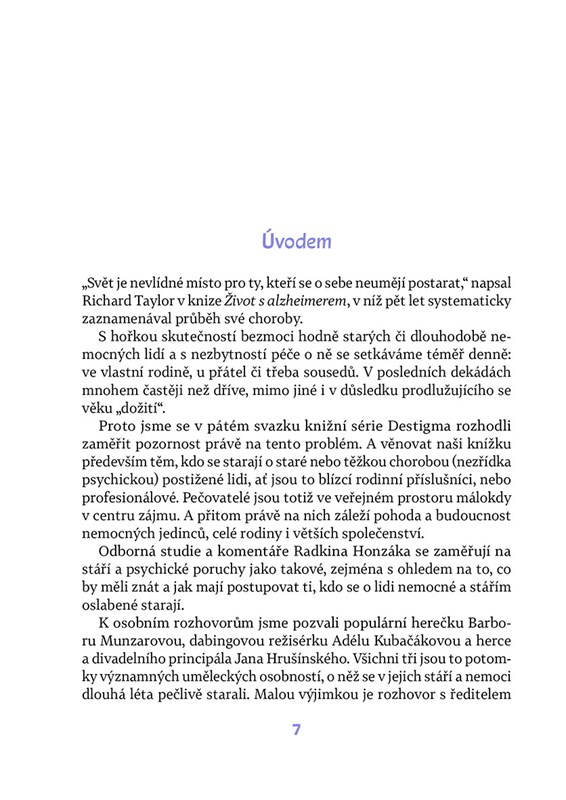 Dlouhodobá péče o blízkého s demencí či jinou těžkou chorobou ve stáří je jedním z nejnáročnějších úkolů, jaké před nás život může postavit, o to těžší, je-li ještě nezbytná péče o vlastní děti.Na mnohé nemoci neexistuje žádný lék, a tak hlavní tíha zůstává na bedrech rodiny. Text známého psychiatra Radkina Honzáka doplňují rozhovory publicistky Agáty Pilátové s lidmi, kteří se k péči o své blízké postavili čelem – Barborou Munzarovou, Adélou Kubačákovou Kačerovou a Janem Hrušínským. Jejich zkušenosti jsou inspirací a povzbuzením pro všechny, kdo hledají sílu k pomoci druhým.