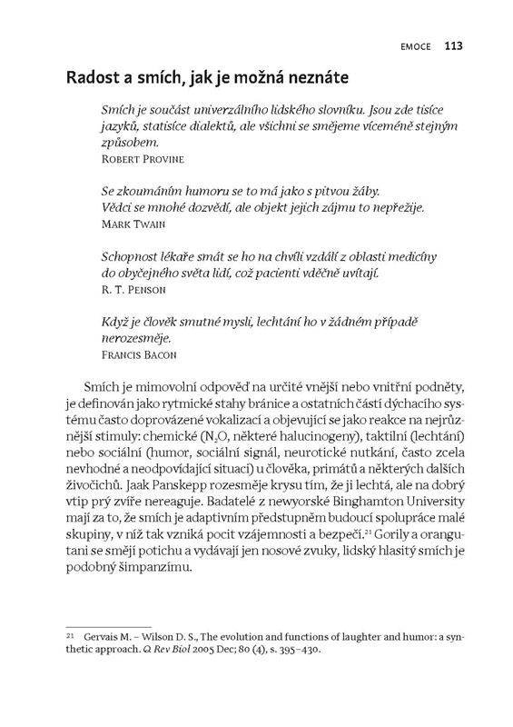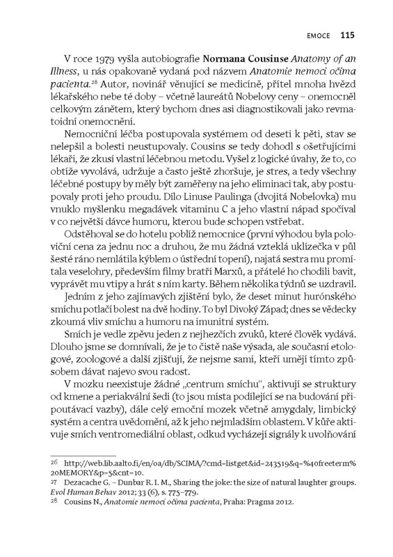 V knize o vztahu lidského těla a duše se významný český psychiatr věnuje celému spektru témat: emocím, léčbě bolesti, nejnovějším studiím o „útrobním mozku“, o účincích spánku, o komunikaci mezi lékařem a pacientem a dalším. MUDr. Honzák v knížce, která je určena jak laické, tak i odborné veřejnosti, se snaží ukázat, jak jsou pro léčení nemocí důležité i faktory sociální a psychologické.