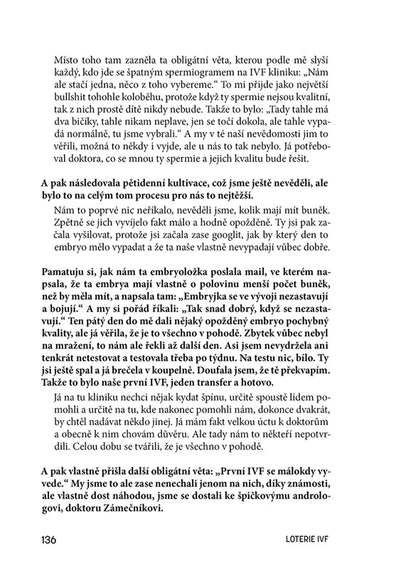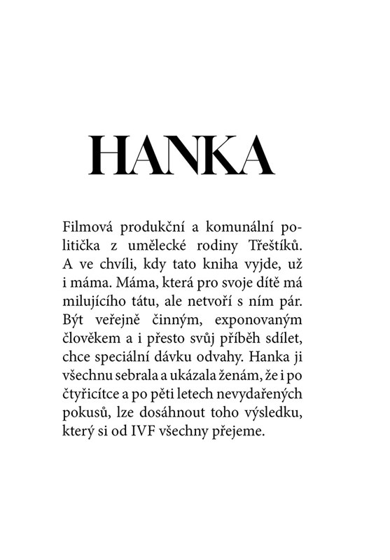 Tohle není jen kniha o IVF. Je to svědectví o odvaze, naději, zármutku i síle. Novinářka Lucie Ptáč-ková přináší rozhovory s těmi, které spojuje zkušenost s umělým oplodněním. Ať už mají za sebou negativní testy, potraty či porod mrtvého dítěte, ať už se dočkali svého potomka, nebo snahu o něj opustili – jsou to hrdinové. Čekejte bolest, smích i otevřenost, která místy bere dech. Pokud zrovna nesete těžký batoh IVF, či jste ho už odložili, ale stopy po popruzích budete mít už navždy – tahle kniha je pro vás.