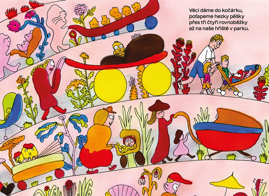 Věci dáme do kočárku, poťapeme hezky pěšky přes tři čtyři rovnoběžky až na naše hřiště v parku…