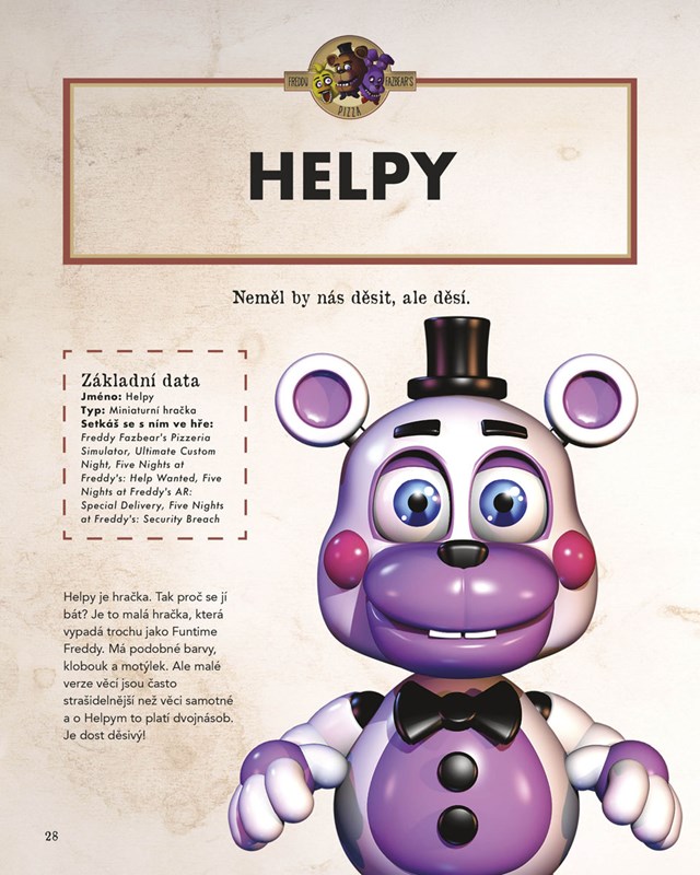 Vydejte se na strhující výpravu do temných zákoutí světa Five Nights at Freddy’s, kde se sny mění v noční můry. Tahle luxusní výpravná encyklopedie vám představí všechny postavy, které se kdy objevily v děsuplných příbězích FNaF. Na více než 200 stránkách plných fascinujících detailů a barevných ilustrací najdete informace, které potěší jak dlouholeté znalce, tak i úplné nováčky, kteří se teprve chystají vstoupit do pizzerie, kde není úplně bezpečno... Ať už vás zajímají skryté odkazy mezi jednotlivými knihami, vývoj postav v čase, nebo prostě jen chcete mít ve své knihovně stylový a sběratelsky cenný kousek, tahle encyklopedie je pro vás jako stvořená.