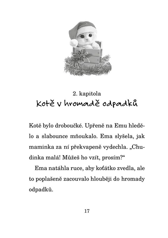 Když jednoho dne před Vánoci vyrazí Ema s maminkou na nákupy, zaslechnou z nedaleké uličky tiché mňoukání. Mezi odpadky pak objeví malé opuštěné kotě, které se třese zimou. Místní útulek je přes vánoční svátky zavřený, a tak nezbývá nic jiného než vzít koťátko domů.