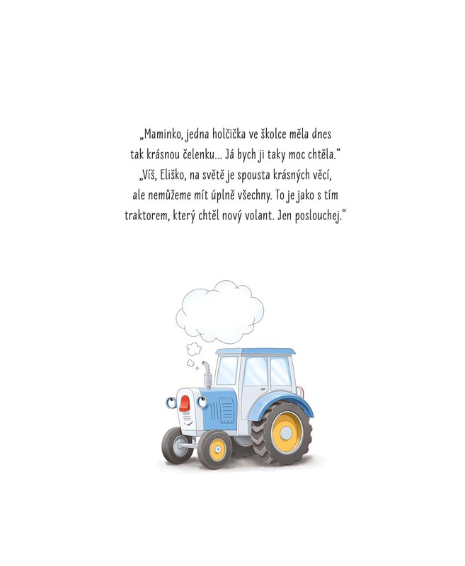 Polepší se domýšlivý traktor Kája? Dočká se traktůrek Víťa nového volantu? Je traktor Popleta opravdu nešikovný? Dokáže traktor Šikula pomoct kamarádovi? Najde si nesmělý traktůrek Eliška kamarády? Nevíte? Tak se rychle dejte do čtení.