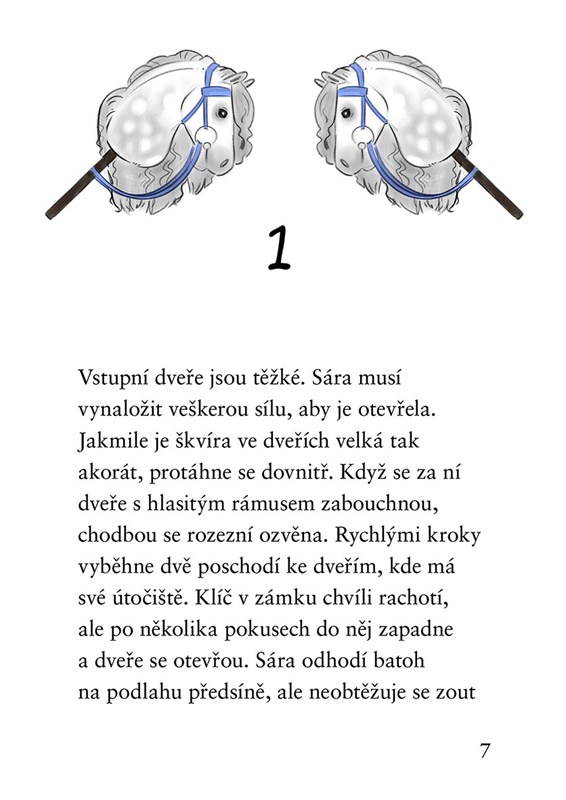 Naštěstí je tu i něco, co Sářiny obavy trochu uklidní – nádherný strakatý kůň s korálkovýma očima, kterého může na závodech vyhrát v tombole. Ten prostě musí být její! A tak s tlukoucím srdcem vyráží na trať…