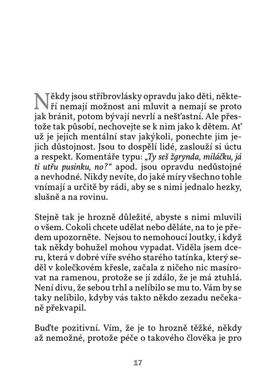 Reakce, průpovídky a poznámky staroušků jsou někdy úsměvné, jindy rozpačité, ale vždy upřímné a vděčné – jako třeba pochvala: „Sestři, vy jste královna sráčů!“ Stříbrovlasé historky z deníku pečovatelky jsou důkazem, že stáří není – a nemělo by být – smutné.