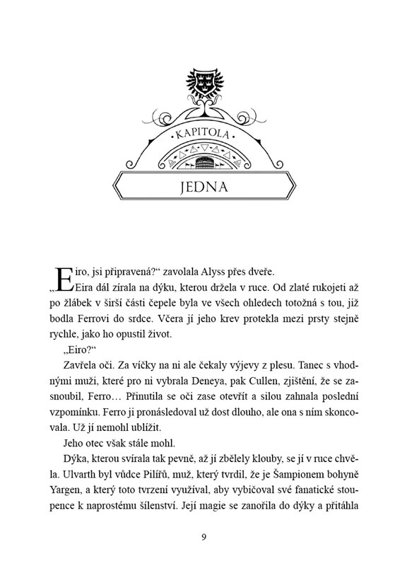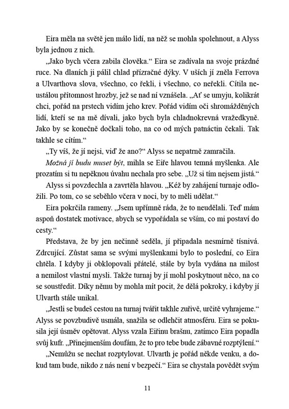 Minulou noc Eira zabila člověka. Okolnosti ji k tomu donutily, mnozí ji teď ale považují za chladnokrevnou vražedkyni a kacířku, která zmařila jejich naděje. Na vysvětlování však není čas, Turnaj pěti království začíná. V době jeho trvání je izolována s ostatními šampiony a musí se vypořádat s intrikami, soupeři i nepřáteli, kteří jí jdou po krku. A co hůř, uvízla v těsné blízkosti muže, který jí zlomil srdce. Jenže v lásce a magii je dovoleno vše. Je Eira připravena na boj svého života?