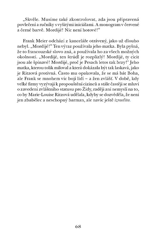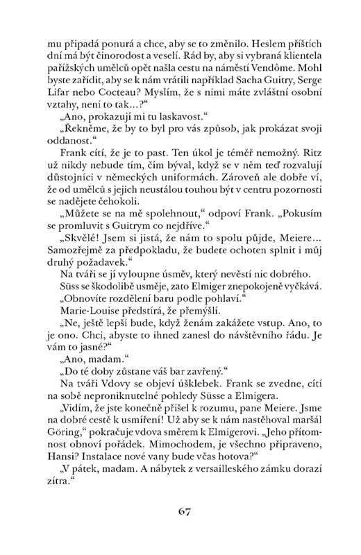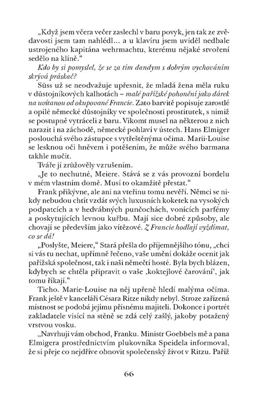 Pozoruhodná historická postava, světoznámý barman Frank Meier, zaujala francouzského novináře Philippa Collina natolik, že se vrhl do studia složité doby německé okupace Paříže. Prozkoumal širokou škálu pramenů a v historickém románu se nám pokusil předat, jak musel tento muž, skrývající vlastní židovský původ, prožívat události druhé světové války.