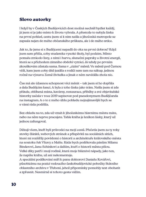 Moderní průvodce pro ty, kdo tu žijí i pro ty, kteří jsou zde poprvé. Poznejte hlavní město jižních Čech jinak, než ho ukazují běžné turistické brožury. Jedenáct procházek očima autorky, která Budějce miluje, vás zavede do známých i skrytých koutů plných zeleně, příběhů a osobité atmosféry. Dozvíte se, proč se v Budějcích říká párku v rohlíku pikador, kde se dobře najíst nebo kam vyrazit na pivo či kávu. A taky jak se vydovádět za každého počasí i s malým doprovodem.