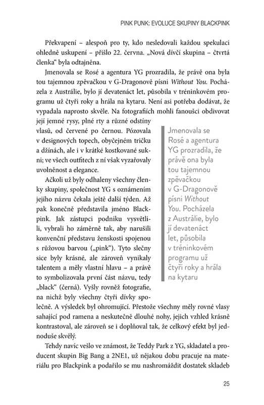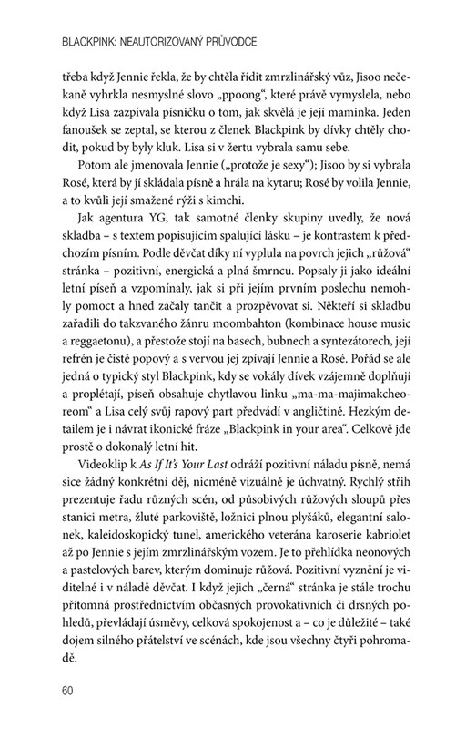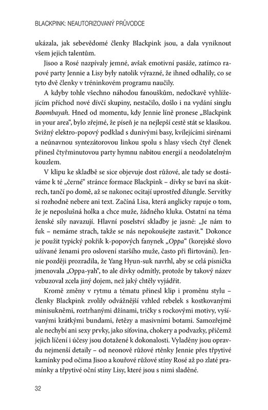 Poznáš Jisoo, Jennie, Rosé i Lisu, čtveřici nesmírně talentovaných děvčat, která bez problémů zpívají, tančí i rapují, a přitom u toho vypadají naprosto skvěle. Není divu, že jsou momentálně nejžhavější popovou formací. V knize se dozvíš o tom, jak dívky trávily léta v tréninkovém programu, jak probíhal jejich debut, ale pochopíš i jejich neutuchající snahu ovládnout svět. Odhalíme ti také osobnosti jednotlivých členek a jejich životní příběhy. To všechno najdeš v tomto průvodci, který tvoří nezbytnou výbavu každého člena fanklubu Blink.