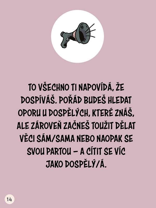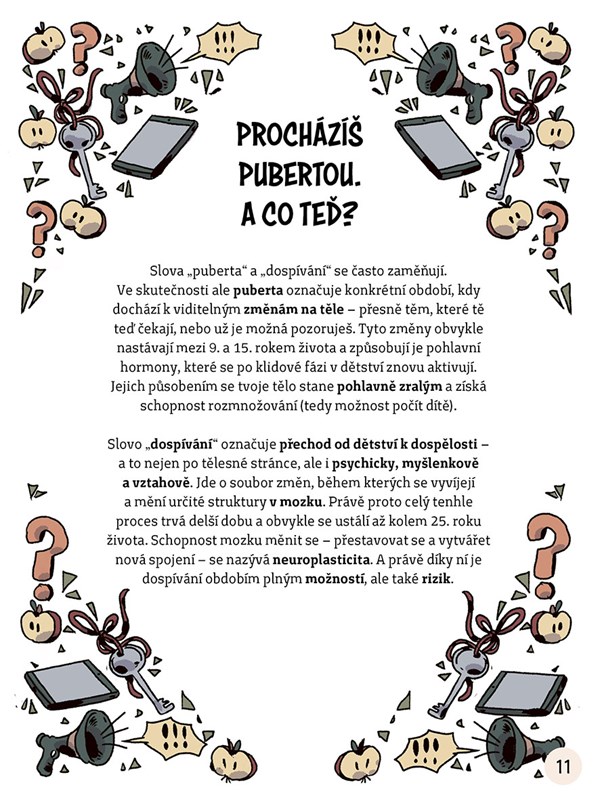 Přečteš si o tom, jak se bude proměňovat tvé tělo i těla ostatních kolem tebe a co všechno tyto změny přinesou. Zjistíš, jak se může změnit tvůj vztah k lidem kolem i to, jak se ve světě dospívajících a dospělých pohybovat bezpečně a s respektem k druhým. Dozvíš se třeba taky, jaký je rozdíl mezi pohlavím a genderem a proč je za všech okolností důležitý tvůj souhlas v jakémkoli vztahu, který navážeš, i že vztahy mohou být různé - a všechny jsou si rovné.