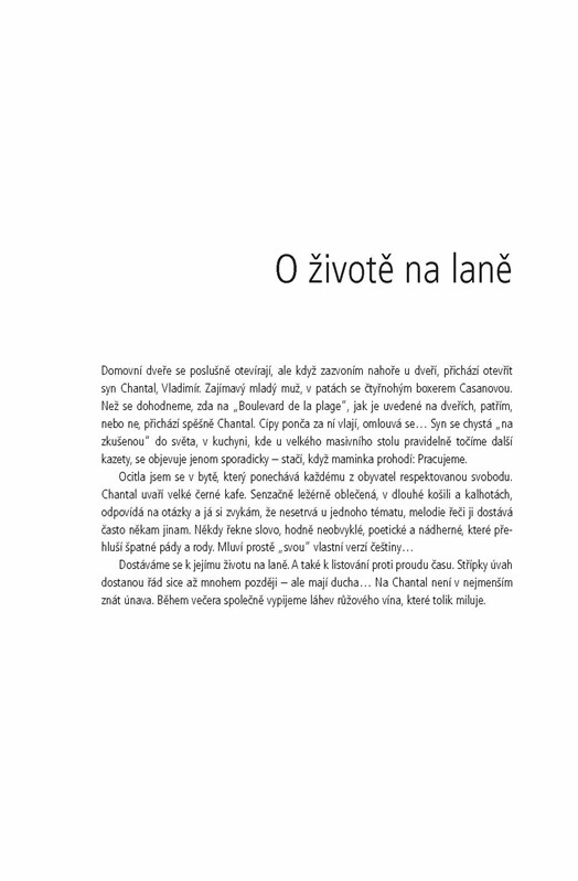 Tato knížka není životopis, ale příběh o cestě česko-francouzské divadelní a filmové herečky, šansoniérky, prezidentky Nadace Archa Chantal, paní Chantal Poullain. Neřeší vlastně svůj život, mluví spíš o výsledcích své dosavadní cesty s mnoha křižovatkami. Označuje ji za život na laně. Má odvahu riskovat jako provazochodec. Neohlíží se na to, jak je lano tenké, nebojí se balancování nebo nejistoty. A přitom dobře ví, že rovnováha je vzácná…