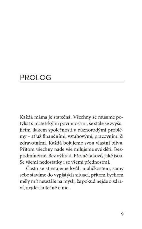 Není pravda, že čas zahojí všechny rány. Dva bolestné příběhy. Dvě maminky. Několik lidských osudů a život, který se s nikým nemazlí. Prožitky matek v nejtěžších chvílích. Od první diagnózy jejich dětí až po dva možné konce. Ten dobrý, i ten tragický. Svědectví o tom, že každá máma je statečná, a pokud nejde o zdraví, nejde o nic. Renáta Navrátilová přináší empatické memento i autentický pohled do zákulisí nemocničního provozu.