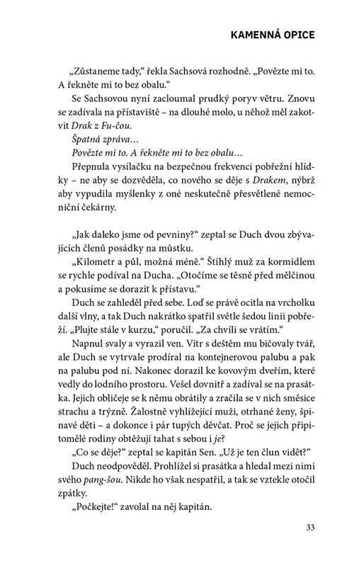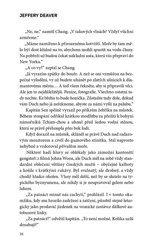 Lincoln Rhyme a Amélie Sachsová před sebou mají téměř nesplnitelný úkol: musejí vypátrat nákladní loď převážející čínské uprchlíky a také nechvalně proslulého pašeráka lidí a vraha, kterému se přezdívá Duch. Akce se nakonec zdaří, ale pokus o Duchovo zadržení se katastrofálně zvrtne. Rhyme a Sachsová vyrážejí na zběsilý závod o jeho dopadení, přičemž musejí najít a zachránit dvě rodiny, které z lodě uprchly a ztratily se v labyrintu čínské komunity v New Yorku. Duch po nich totiž pátrá s nevídanou bezcitností. Zatímco Rhyme se s pomocí podivínského čínského policisty snaží dopadnout Ducha, Sachsová k případu přistupuje trochu jinak – sblíží se s jedním z uprchlíků, což může ovlivnit nejen celé vyšetřování, ale také její vztah s Lincolnem Rhymem.