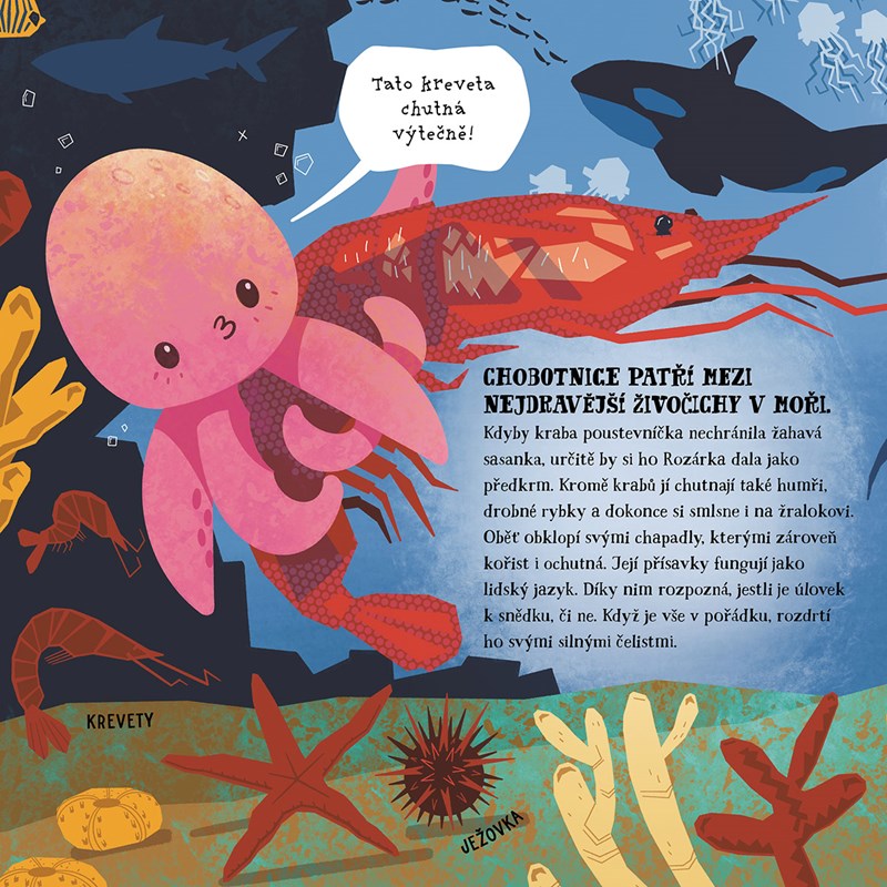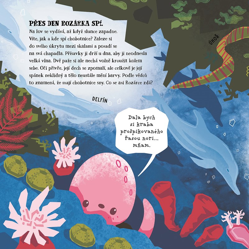 Chobotnička Rozárka Vás bude bavit uměním, jak rychle zmiznout z dohledu, malí čtenáři s ní prozkoumají korálový útes, vrak lodi a dozvědí se, proč je příliv a odliv nebo kdo bydlí v nejtemnějších hlubinách.