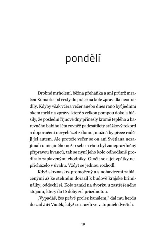 Kapitán Jaroslav Komárek neprožívá zrovna nejklidnější období. S bývalou manželkou se dohaduje kvůli alimentům a jeho dlouholetý parťák vážně onemocněl. Snaha dát si život do pořádku ale musí počkat – z rybníka vyplavala mrtvola mladé ženy. Obětí je pohledná masérka. A vrahem? S největší pravděpodobností některý z jejích sousedů. Obyvatelé zcela obyčejného bytového domu totiž skrývají nejedno tajemství.