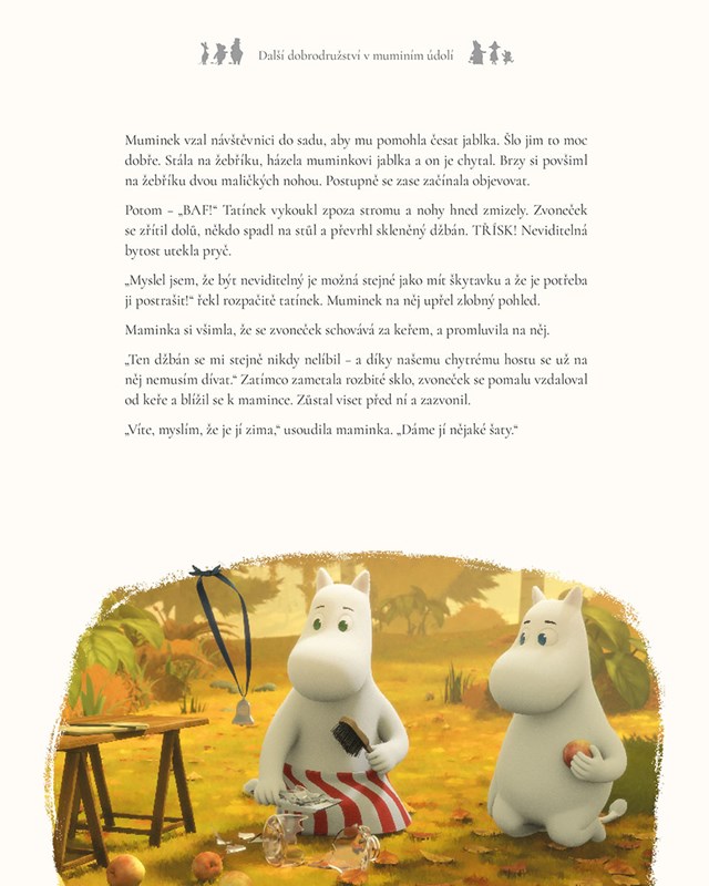 Vydejte se s námi do muminího údolí s touto krásnou knížkou příběhů, v nichž se mumini a jejich přátelé setkají s neviditelným dítětem, budou vyšetřovat tajemné zmizení a zažijí zimní dobrodružství. Život v muminím údolí je plný překvapení, ale mumini zvládají nečekané příhody s humorem a dobrým srdcem.