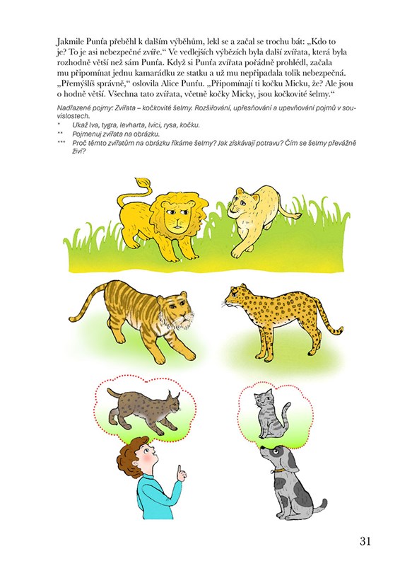 * Především systém podnětů pro rozvoj řeči a slovně logického myšlení formou povídání, her a dalších aktivit. Řazení činností kopíruje a respektuje vývojové fáze slovní zásoby a porozumění řeči od pasivní úrovně po aktivní slovník. Náročnost úkolů se stupňuje od těch pro dítě méně obtížných po obtížnější, představující vývojově vyšší roviny. Náměty jsou nabízeny tak, jak se dítě s pojmy a situacemi může setkávat. Je vytvářen prostor k propojování jednotlivých informací, přemýšlení ve vzájemných vazbách a souvislostech.