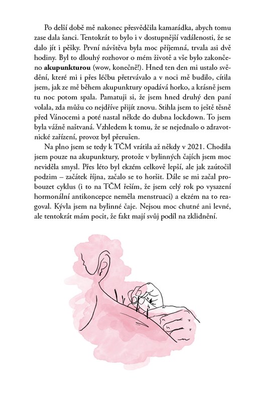 Tato kniha je autentickým a hluboce osobním svědectvím o životě s atopickým ekzémem – nemocí, která zasahuje mnohem víc než jen kůži. Autorka otevřeně sdílí svou cestu od dětství s mírným ekzémem přes bolestivé období plné fyzického i psychického vyčerpání až po zásadní rozhodnutí opustit klasickou léčbu a začít naslouchat vlastnímu tělu. Popisuje své zkušenosti s vysazením kortikoidů, těžkým abstinenčním syndromem (TSW), ale také s hledáním alternativních cest – od změny životního stylu přes terapii až po komunitní podporu.