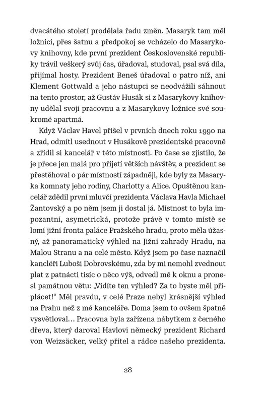 Václava Havla tak poznáme mnohem důvěrněji než z médií, kniha uvádí tisíce drobných detailů, kterých si autor za těch téměř 4000 dnů po jeho boku nemohl nevšimnout. Dozvíme se, co a koho Havel měl rád, ale také s jakými problémy se musel během prezidentské funkce na Hradě vyrovnat. Poznáme zblízka světové osobnosti, se kterými Havel během svého mandátu spolupracoval, vrátíme se k důležitým událostem uplynulých dvaceti let, ve kterých hrál Václav Havel důležitou roli.