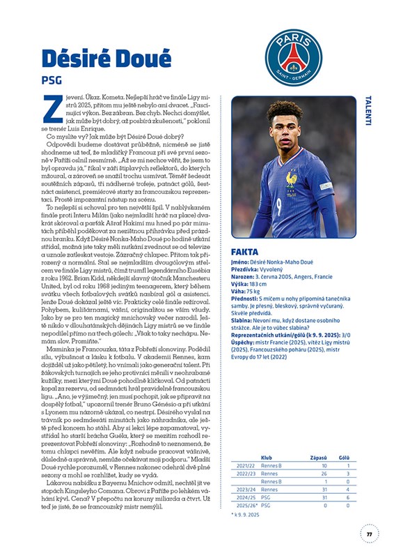 Nenechte si ujít vyprávění od předních českých novinářů věnujících se nejprestižnějším fotbalovým ligám a evropským pohárům! Nejlepší brankáři, obránci, záložníci a útočníci, nejúspěšnější trenéři i nejtalentovanější hráči z celého světa – ty všechny teď poznáte v důkladně zpracovaných profilech. A těšit se můžete i na spoustu fotek a podrobné statistiky.