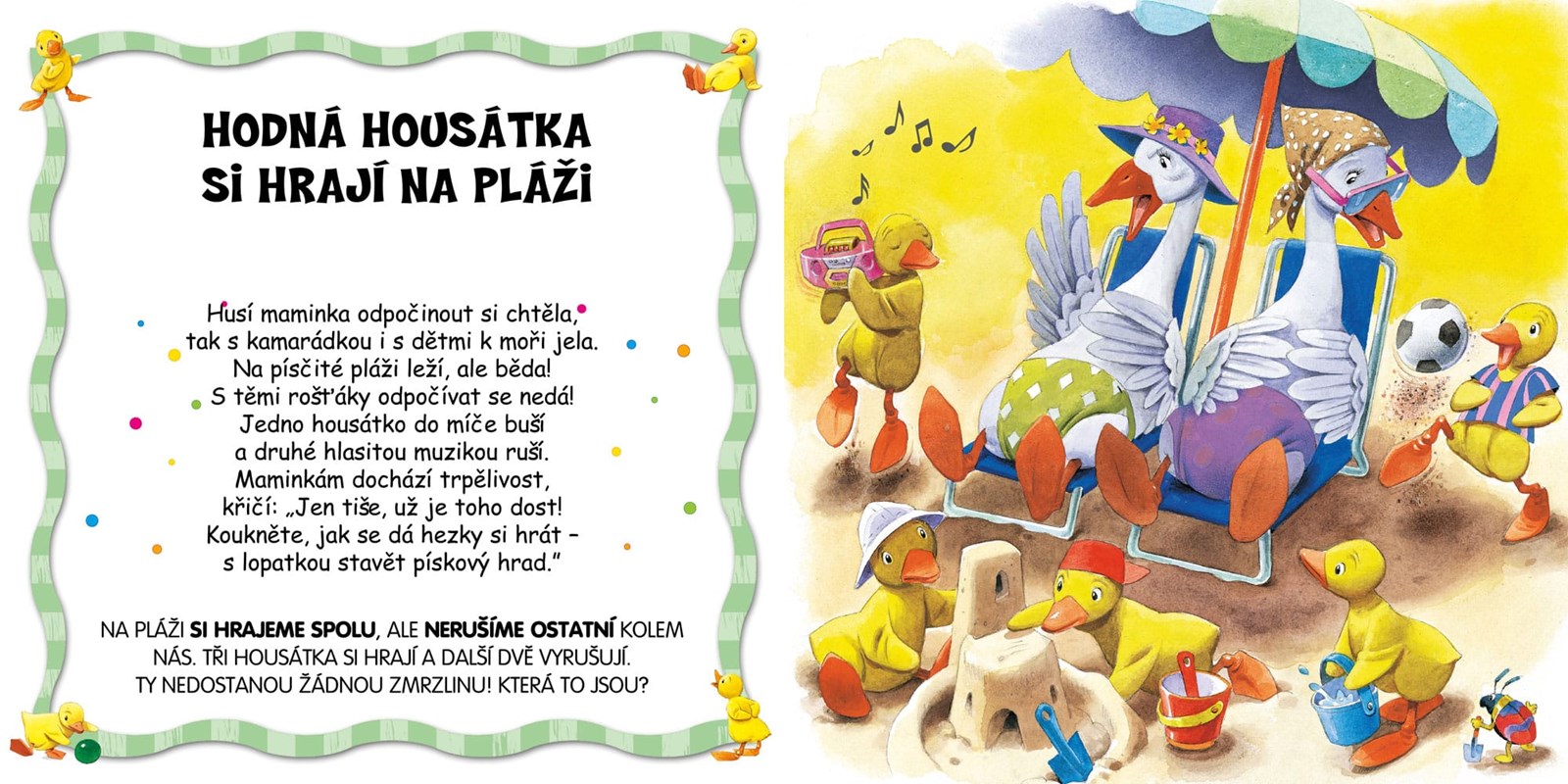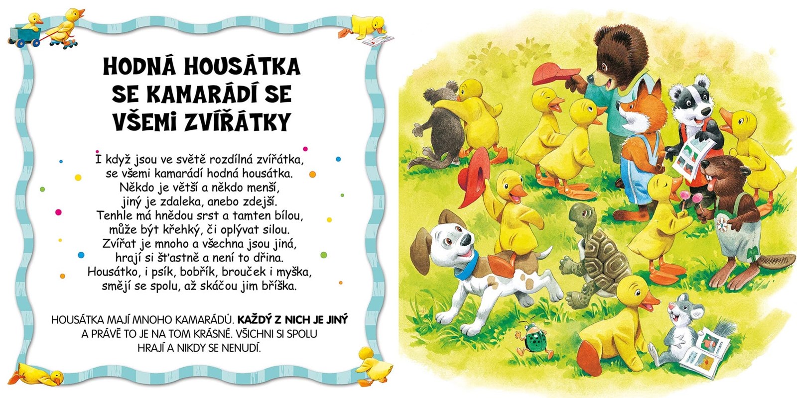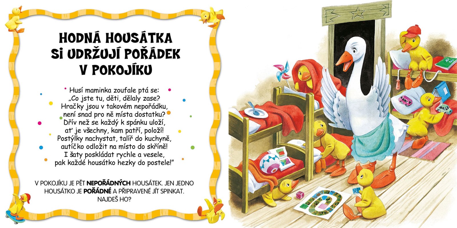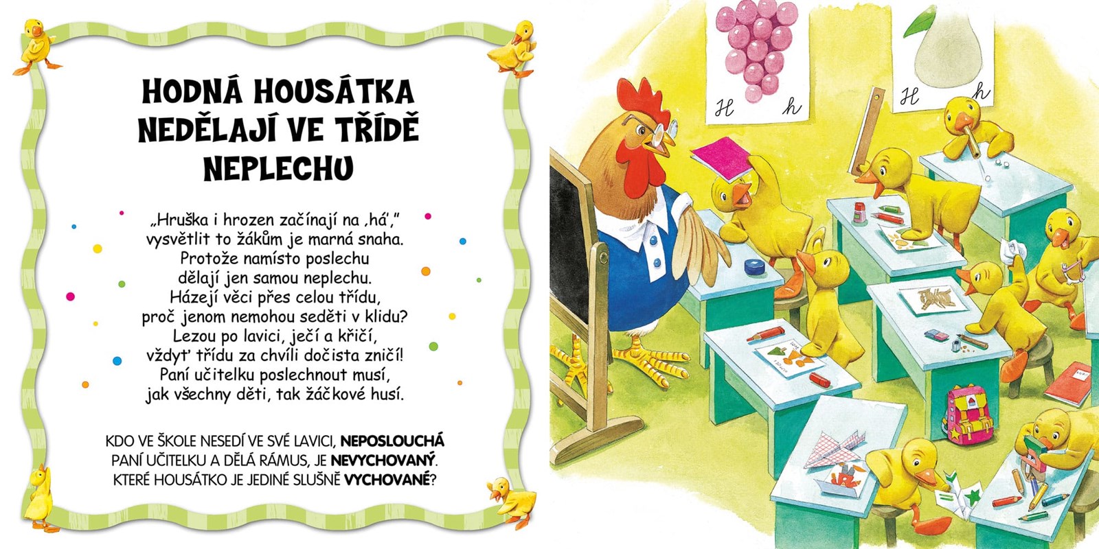 Máma husa učí svoje milovaná housátka, jak se mají chovat doma, ve škole, při procházce ve městě i v přírodě a mezi sebou navzájem. Housátka maminku vždy poslouchají a její rady si vezmou k srdci. Chtějí se chovat slušně, být čestné a odvážné a mít hodně kamarádů. Série husí máma přináší veselá poučná leporela, která formou básniček učí děti o slušném chování, plynutí ročních období, barvách a číslech.