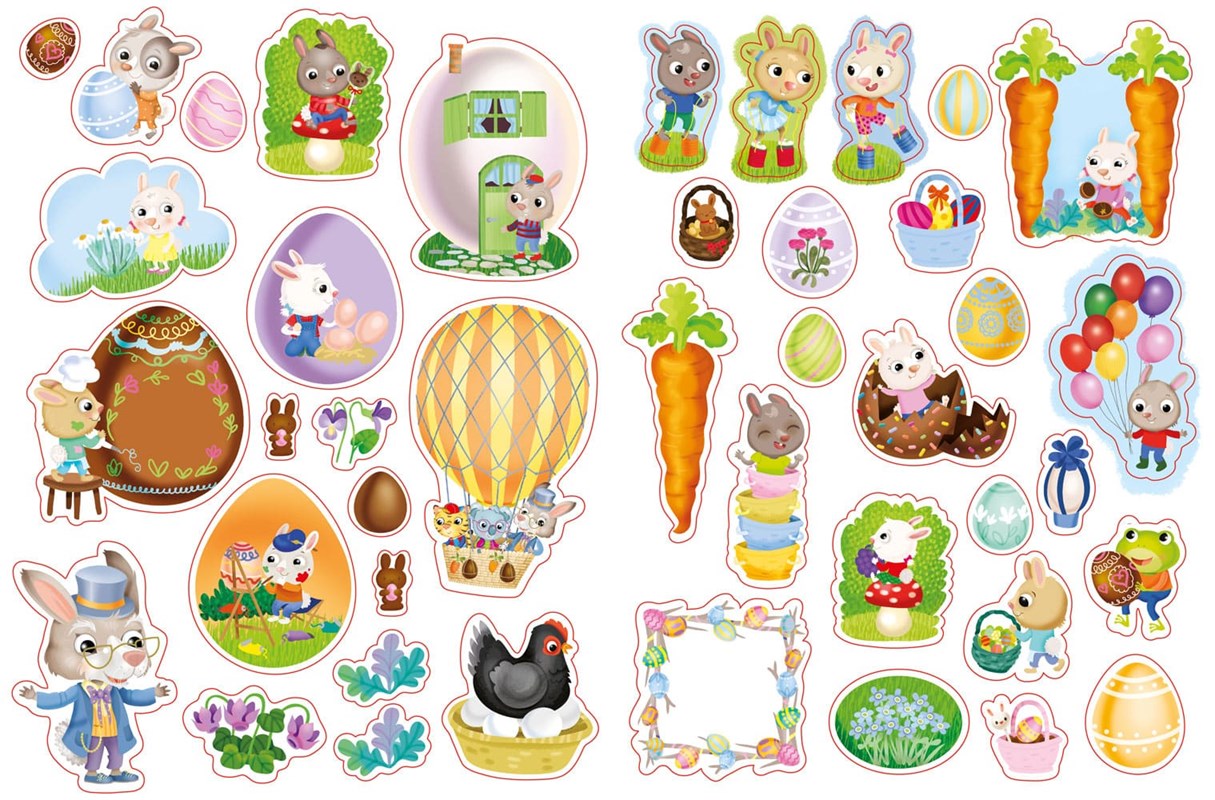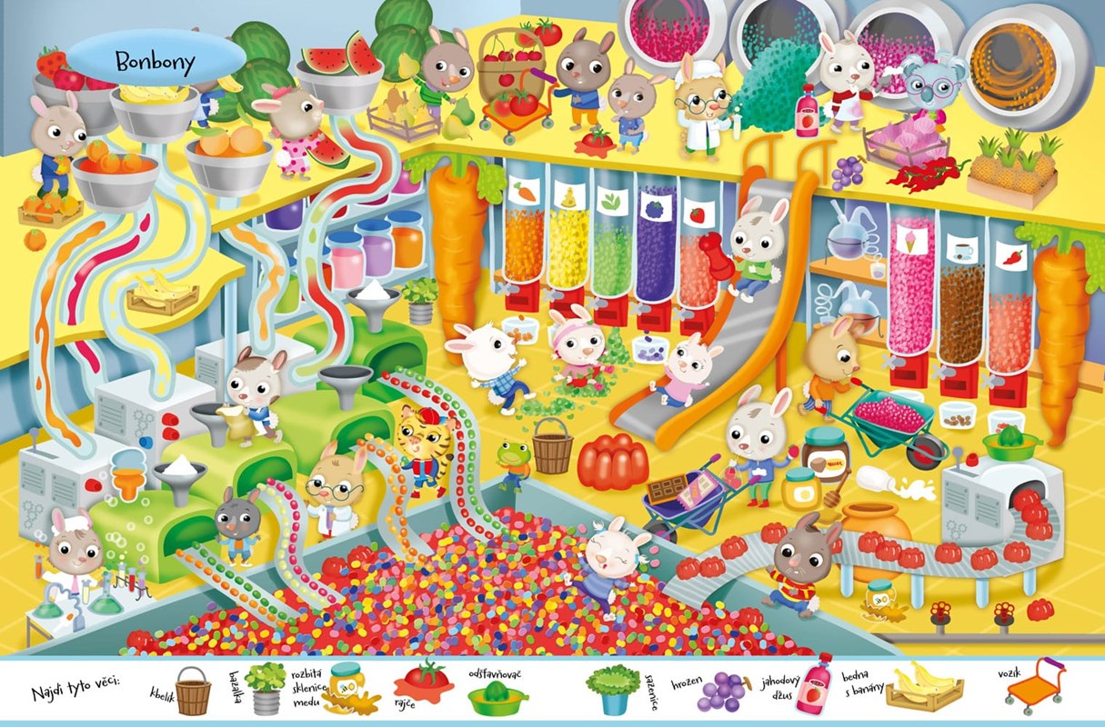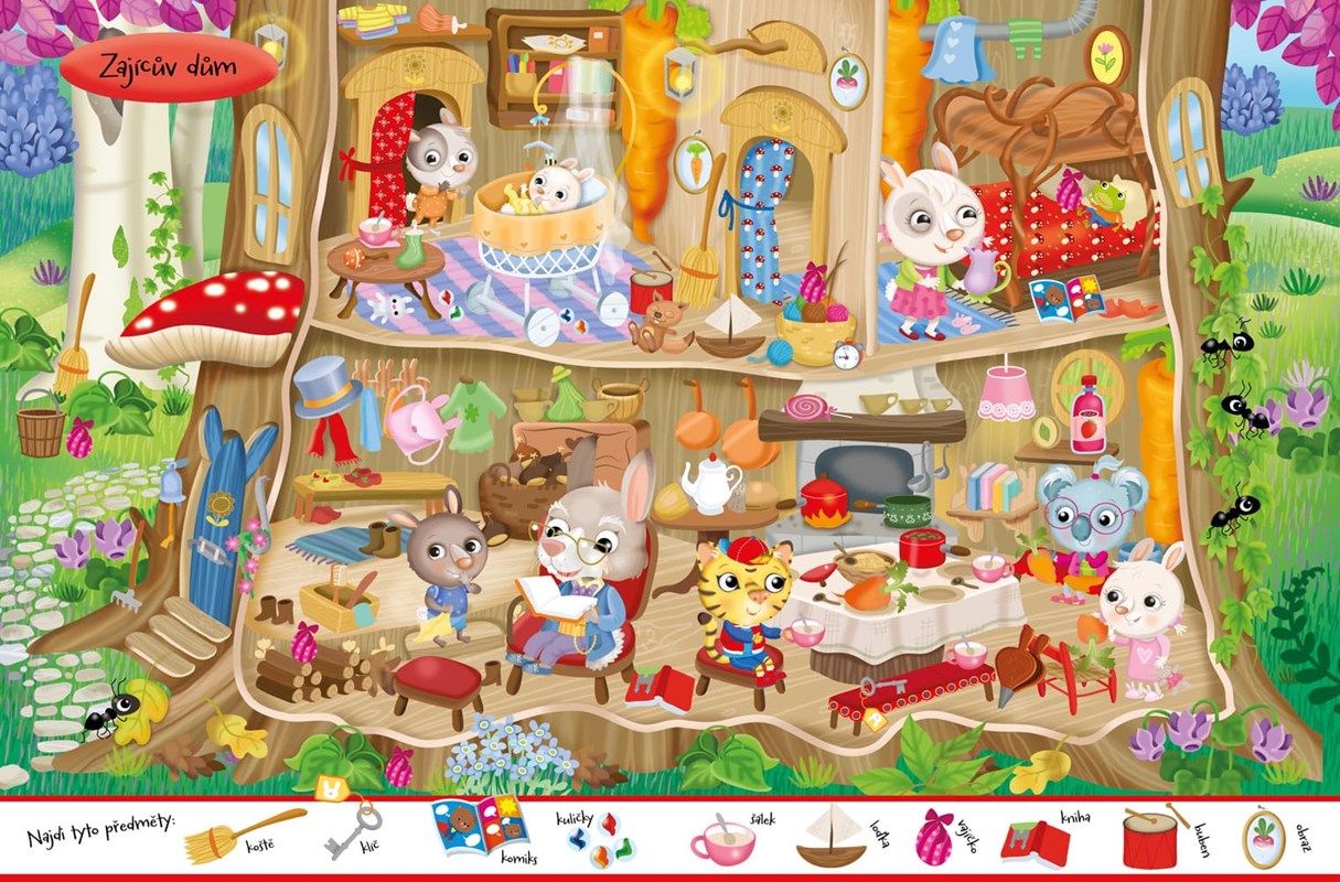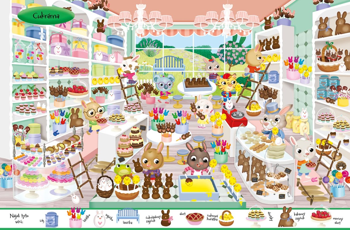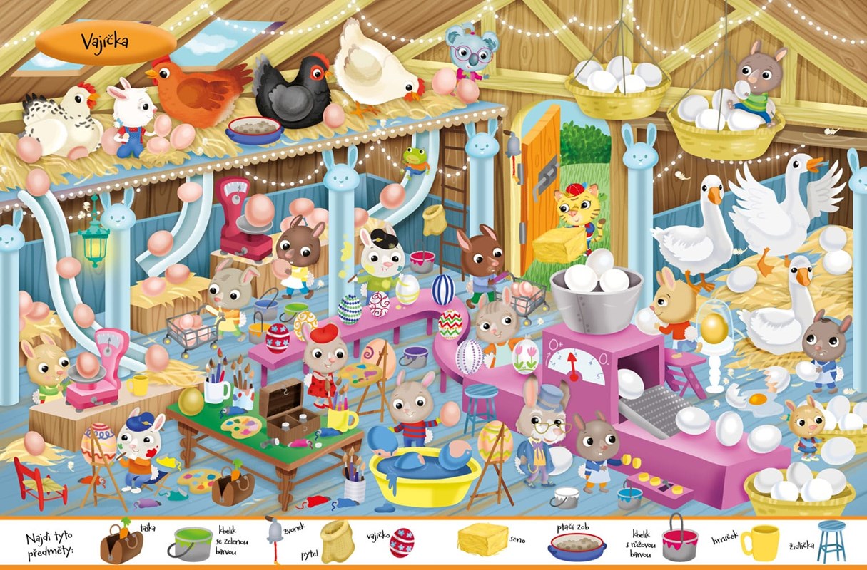 V jedno slunečné jarní ráno si koala Ela, tygřík Ferda a žabák Kva-kva našli v poštovní schránce netradiční dopis se dvěma bílýma ušima. Byli zvědaví, kdo jim píše. Po přečtení dopisu zjistili, že je velikonoční zajíc zve k návštěvě do Zaječí země. Kamarádi se velmi potěšili, neváhali a vyrazili na cestu. Přidej se k nim a otáčejíce stranu po straně hledej a najdi různé předměty z obrázků čokoládovny, výrobny bonbonů či ze zahrady velikonočního zajíce. Zároveň hledej na každé dvoustraně tři roztomilé hlavní hrdiny.