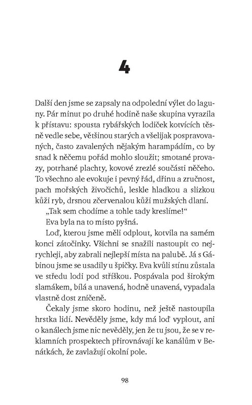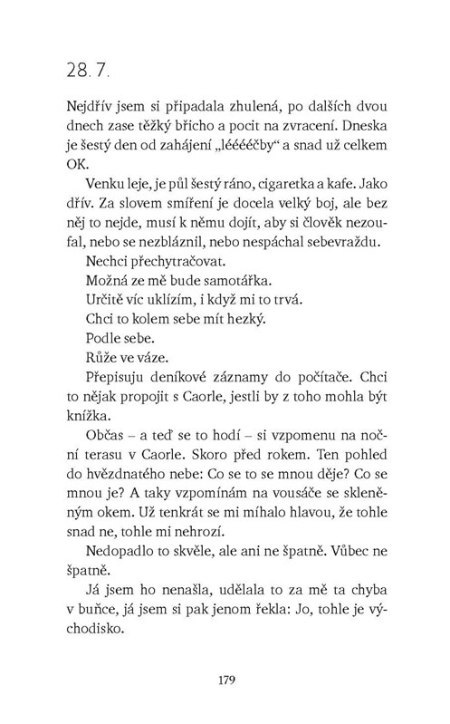 Slunce, moře, písek, dým z cigarety… Zapomenout na věk, prostě být, cítit se milovaná a šťastná. Tři kamarádky tráví dovolenou u moře v italském letovisku Caorle. Počáteční idyla se rozpouští. Místo ní se prohlubují pocity osamělosti, strach z přicházejícího stáří, vzájemné averze a dozvuky minulosti. V příběhu vztahového propletence tří žen je melancholie i tragikomično, okamžiky nesnesitelnosti i soucitu. Do fikce však postupně proniká opravdový život, a tak autorka opouští částečně vymyšlený příběh, aby se s tím, co začalo v Caorle, už vyrovnala sama.