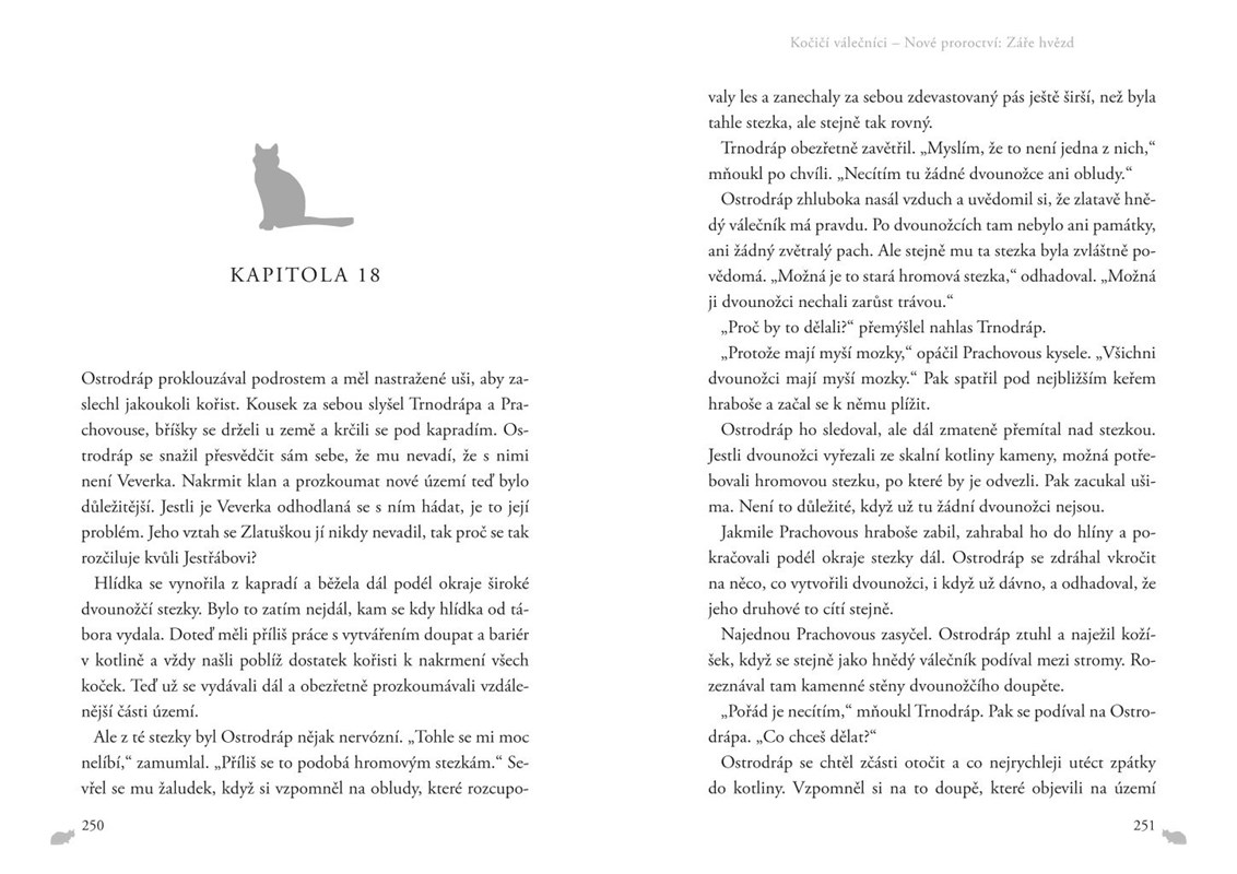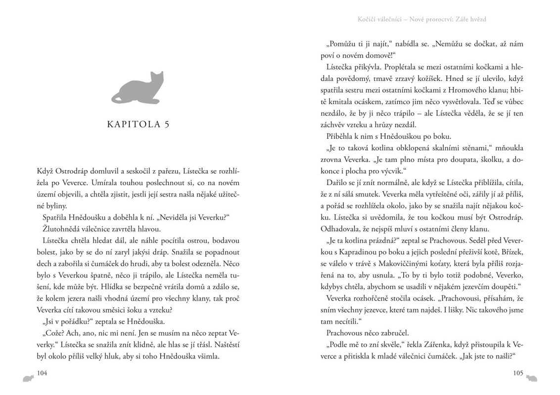 Po zničení lesa a cestě plné útrap kočičí hrdinové konečně nalezli nový domov. Začínají ale problémy s vytyčením nových území klanů a také s hledáním náhrady za Měsíční kámen – místa, kde se kočky mohou spojit s Hvězdným klanem. Jaké nástrahy na ně v neznámém kraji číhají? Kdo potajmu spřádá zlověstné plány? Válečníci čekají na znamení z hvězd a už brzy pochopí, že hrozby doutnající uvnitř klanů mohou být stejně nebezpečné jako ty, jimž čelili v lese.