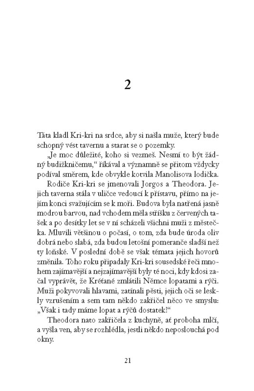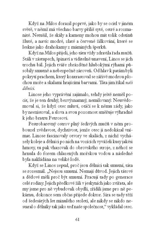 Na sluncem zalitém řeckém ostrově vyrůstá Kri-kri, dívka divoká jako horská koza. Její svět plný svobody, vůně moře a rodinné pospolitosti náhle zničí druhá světová válka. Z dětství zůstane jen popel, rozmetaný dívčiným nečekaným mateřstvím. Ženy jejího rodu měly vždy jen jednu dceru, ale Kri-kri v šestnácti letech přivede na svět trojčata. Osud její i jejích dětí se proplétá s historií ostrova, který i po válce bojuje o přežití tváří v tvář nové invazi – davům turistů. Nehledejte ten ostrov, může to být nebezpečné.