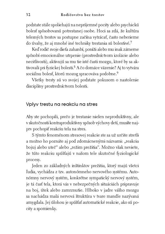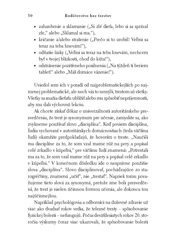 Na stránkach knihy Rodičovstvo bez trestov, plných najužitočnejších poznatkov z výskumu v oblasti vývojovej psychológie detí, neurológie a pediatrie, sa čitatelia stretnú s príbehmi rodín, ktoré sa naučili používať nástroje vychádzajúce z metódy celostného rodičovstva. Ich výsledkom je partnerská spolupráca medzi rodičmi a deťmi, keď pokoj a empatia vystriedajú krik a tresty.