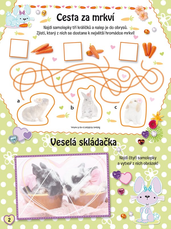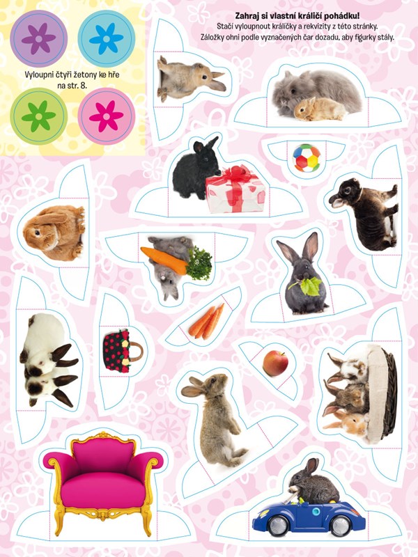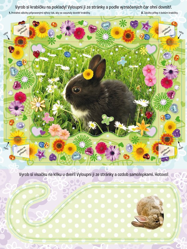 Díky téhle knížce si přijdou na své všichni malí milovníci hebkých králíčků, které baví hrát si se samolepkami, kreslit i vybarvovat obrázky, řešit hádanky nebo plnit nejrůznější úkoly. Pomocí archu s vymačkávacími tvary si děti navíc mohou vyrobit figurky k zábavné hře nebo si sestavit krabičku na poklady, to vše pod dohledem roztomilých chlupatých mazlíčků.