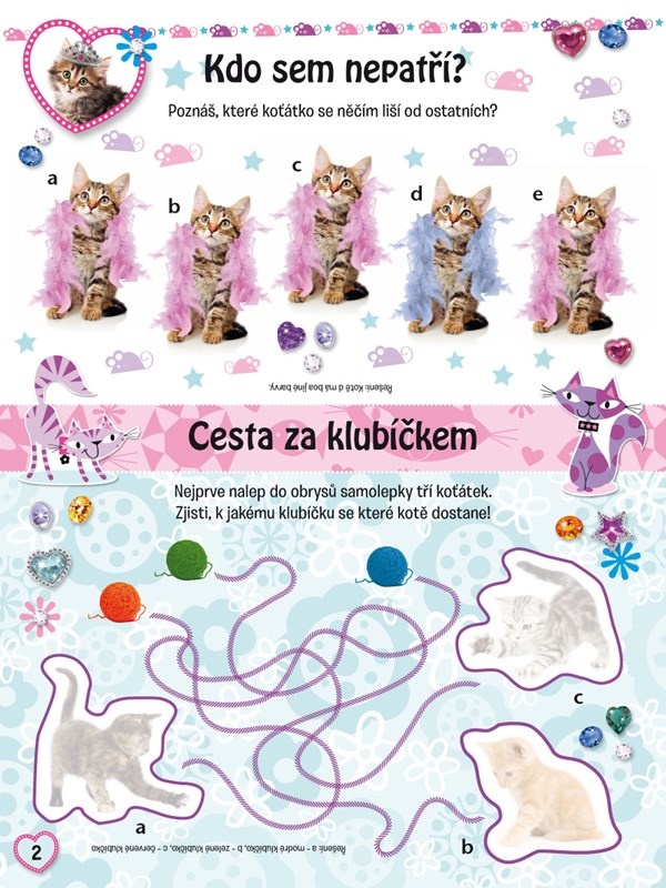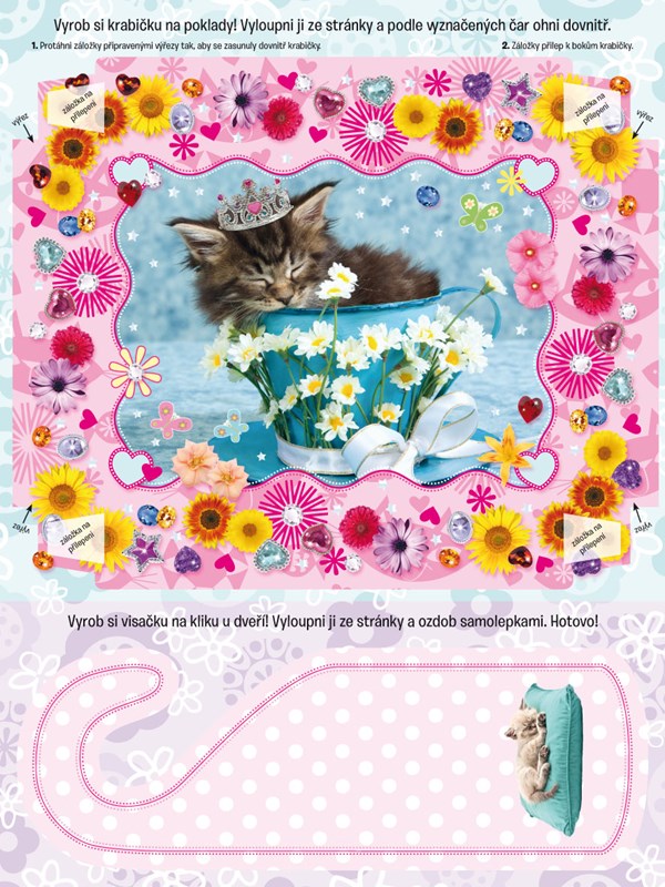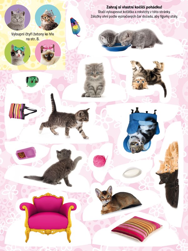 Díky téhle knížce si přijdou na své všichni malí milovníci koček, které baví hrát si se samolepkami, kreslit i vybarvovat obrázky, řešit hádanky nebo plnit nejrůznější úkoly. Pomocí archu s vymačkávacími tvary si děti navíc mohou vyrobit figurky k zábavné hře nebo si sestavit krabičku na poklady, to vše pod dohledem roztomilých chlupatých mazlíčků.