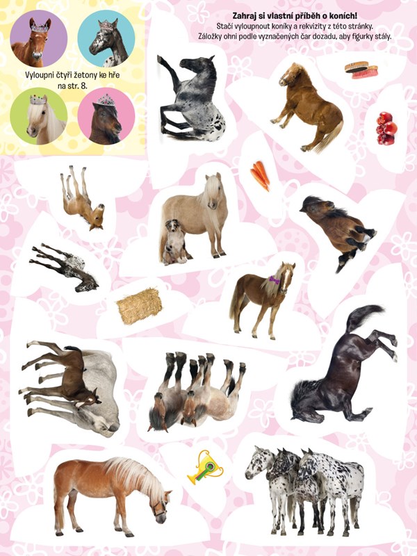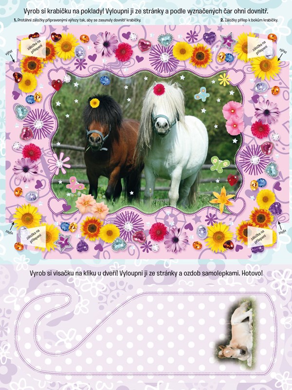 Díky téhle knížce si přijdou na své všichni malí milovníci koníků, které baví hrát si se samolepkami, kreslit i vybarvovat obrázky, řešit hádanky nebo plnit nejrůznější úkoly. Pomocí archu s vymačkávacími tvary si děti navíc mohou vyrobit figurky k zábavné hře nebo si sestavit krabičku na poklady, to vše pod dohledem roztomilých chlupatých mazlíčků.