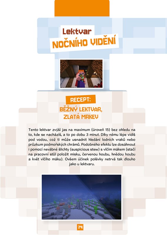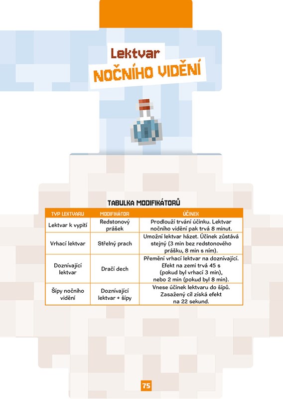 Nauč se hledat vzácné ingredience ve všech biomech a uvařit z nich ty nejúžasnější lektvary, které ve hře existují! Ať už chceš plavat v lávě, dýchat pod vodou nebo skákat z útesů bez rizika, tahle kniha ti prozradí všechny triky a recepty, které potřebuješ k prožití nezapomenutelných okamžiků.