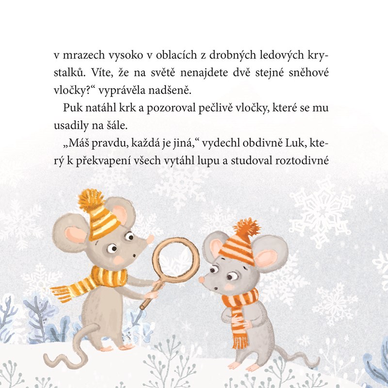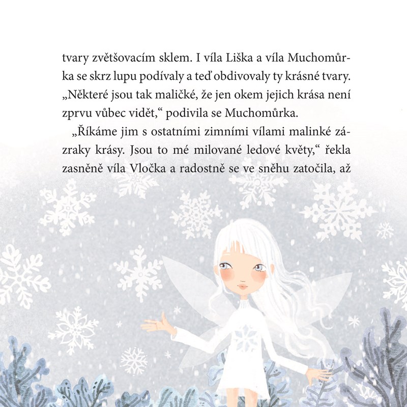 Pokračování oblíbené knížky od spisovatelky a ilustrátorky nás tentokrát zavede do pohádkové zimy. Víla Muchomůrka se svými kamarády vydává na dobrodružnou výpravu zasněženým lesem. Všichni hledají ztracenou medvědici, která odešla ze svého doupěte uprostřed zimního spánku. Průvodkyní jim je víla Vločka, která je oproti našim kamarádům v zimní krajině jako doma. Nejen že jim pomůže najít cestu, ale taky se toho díky ní o zimě hodně dozvědí. Na cestě potkají nové přátele a také odhalí, že zima není jen studená a tichá – má své kouzlo a skrývá v sobě i velká překvapení.