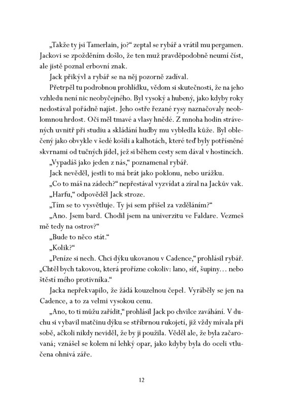 Jack Tamerlain před deseti lety opustil ostrov Cadence, aby se stal bardem na pevninské univerzitě. Když však začnou z ostrova mizet dívky, je povolán zpět domů. Adaira, dědička východní části ostrova a Jackova bývalá rivalka, věří, že jedině bardova hudba dokáže přivolat duchy živlů a záhadu objasnit. Netrvá dlouho a jejich někdejší soupeřivost se mění v křehké spojenectví, ze kterého se zrodí víc než jen hudba. Jenže pod povrchem se skrývají temná tajemství a stačí málo, aby se celý svět ocitl v ohrožení…
