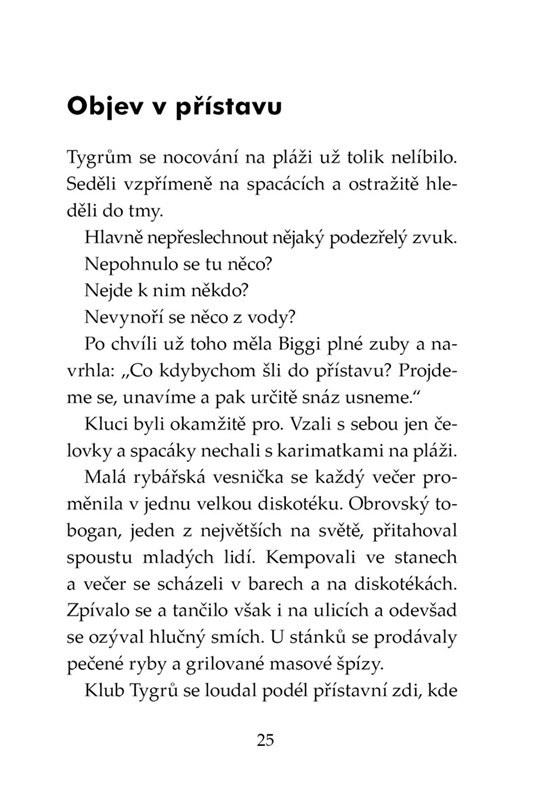 Klub Tygrů tráví prázdniny u moře. Během jedné noční výpravy se Biggi, Luk a Patrik setkají s pomateným mužem, který několika záhadnými poznámkami vzbudí jejich zvědavost. Co nebo kdo je za podivnými událostmi, které se v okolí odehrávají? Lidé si vyprávějí historky o zatopené ruině hradu a obrovských žralocích na dně moře. Podaří se Klubu Tygrů odhalit pravdu? Pátrání je dostane na stopu zločinu a sami se nakonec ocitají v ohrožení života.