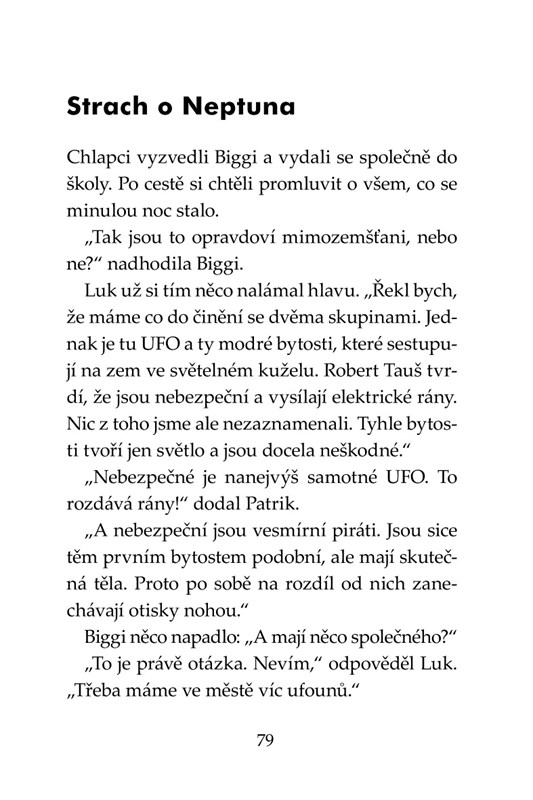 Členové Klubu Tygrů se stanou svědky neuvěřitelné události – v tajemném lese poblíž města přistane vesmírná loď. Z ní jsou na Zemi vysíláni pomocí světelných paprsků mimozemšťané, kteří rychle zmizí mezi stromy. Biggi, Luk a Patrik se shodnou, že záhadné bytosti vypadají neškodně. Když se ale vrátí do města, vše je vzhůru nohama. Podaří se jim odhalit, co se vlastně stalo? A proč se UFO objevilo zrovna tady?