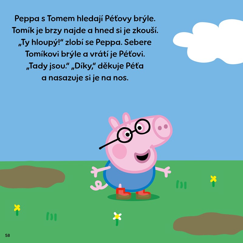 V další knížce příběhů o prasátku Peppě najdete čtyři nové příběhy vaší oblíbené hrdinky. Přečtete si o tom, jak Peppa poprvé spala u kamarádky, o výletě do přírody, o tom, jak si Peppa moc přála nové brýle, a nakonec o nastydlém Tomíkovi. Pěkné čtení!