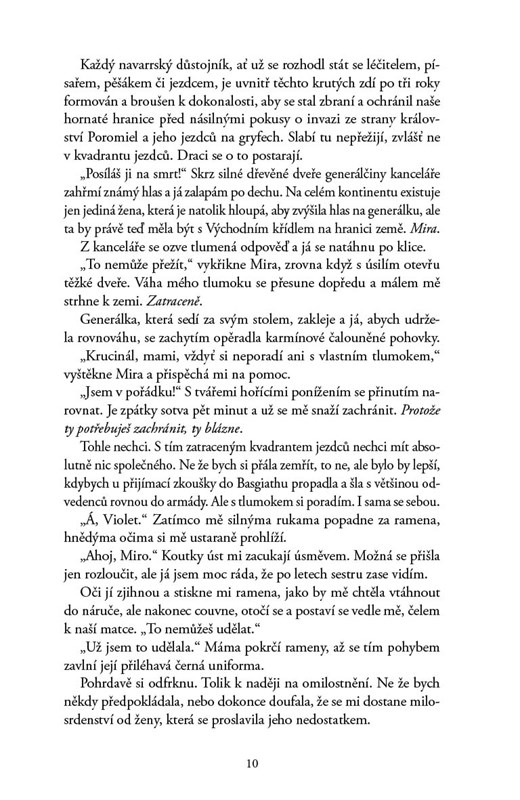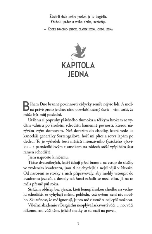 Dvacetiletá Violet Sorrengailová měla nastoupit do kvadrantu písařů a strávit život mezi knihami. Její matka, nesmlouvavá velící generálka, jí však nařídí, aby se připojila ke stovkám kandidátů toužících dostat se mezi navarrskou elitu: dračí jezdce. Violet chybí trénink, navíc je menší než ostatní a draci se s „křehkými“ lidmi nespojují. Spálí je! Proto bude potřebovat všechen svůj důvtip, aby obstála. Brzo ale zjistí, že z Basgiathské válečné školy vedou jen dvě cesty ven: absolvovat, nebo zemřít.