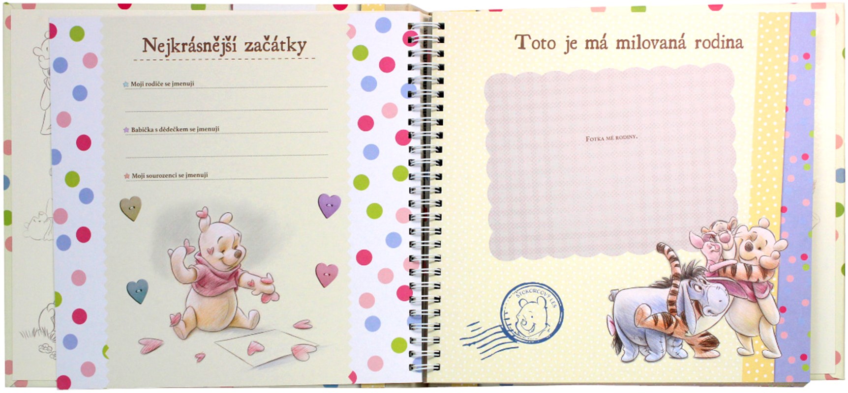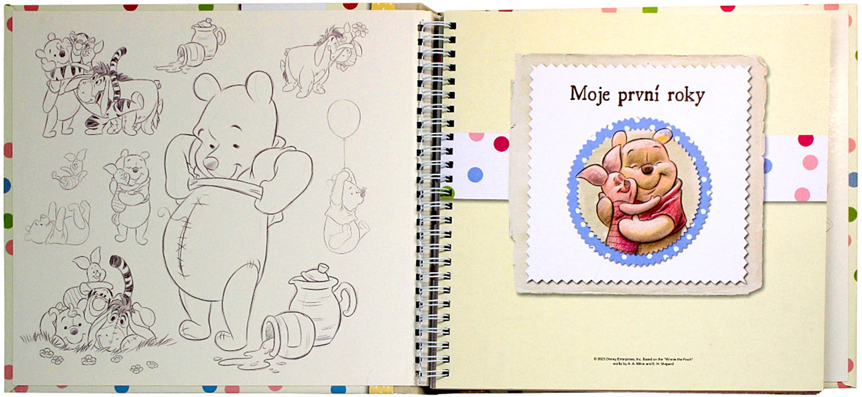 Tato půvabná knížka vám pomůže zachytit všechny krásné okamžiky spojené s příchodem vašeho miminka. V deníčku uchováte vzpomínky, zážitky, důležité chvíle i fotky od prvního dne, kdy jste zjistili, že přijde na svět, až do jeho třech let. Knížku doplňují roztomilé a něžné obrázky oblíbených postaviček Medvídka Pú a jeho kamarádů ze Stokorcového lesa.