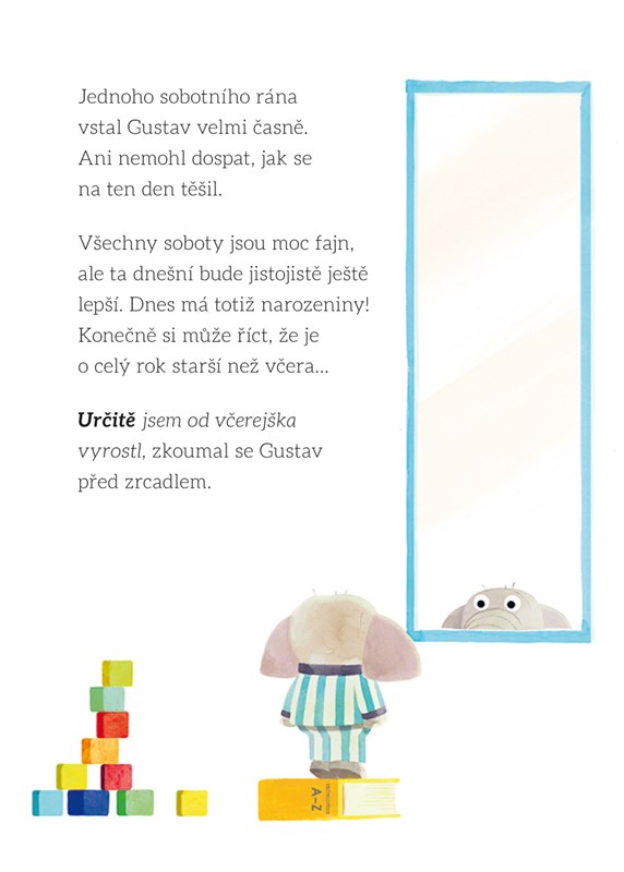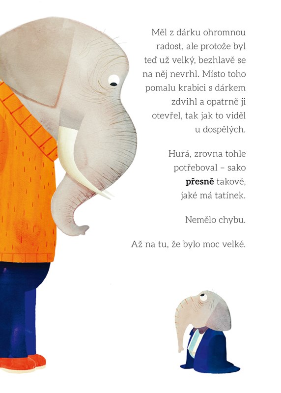 Když sloník Gustav dostane k narozeninám nové sáčko, je nadšený. Jenže jeho radost vystřídá zklamání ve chvíli, kdy si ho zkusí a zjistí, že je mu příliš velké. Je skutečně sako moc velké, nebo je Gustík moc malý? Podaří se tatínkovi v tenhle velký den rozptýlit synkovy obavy?