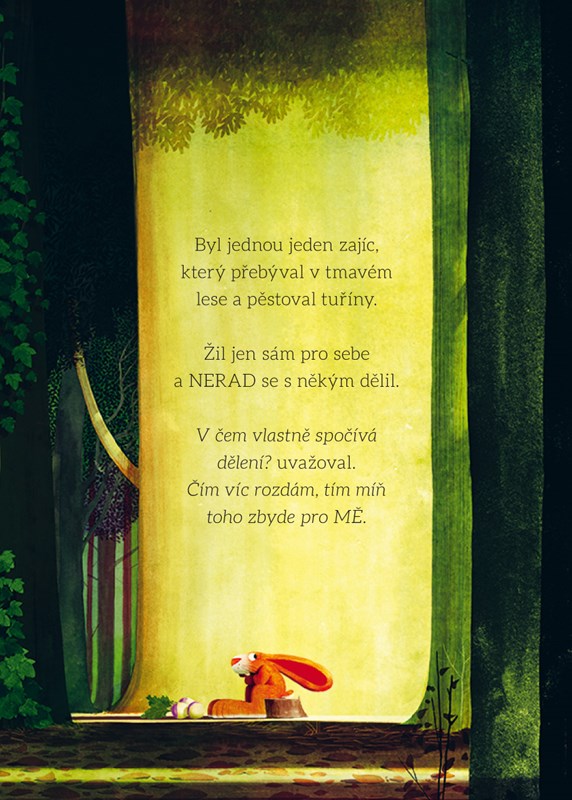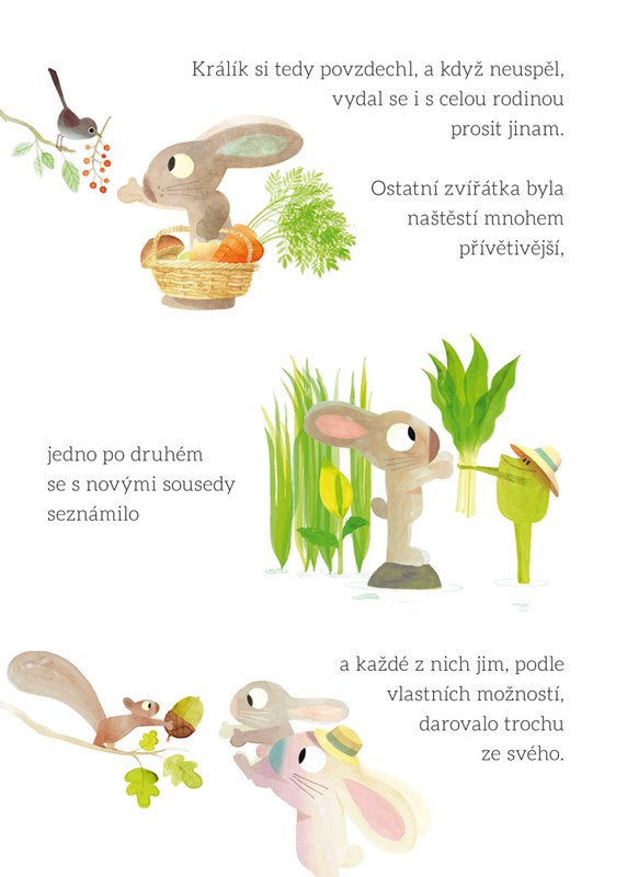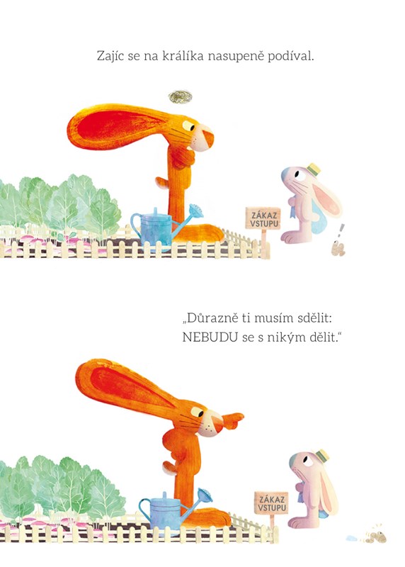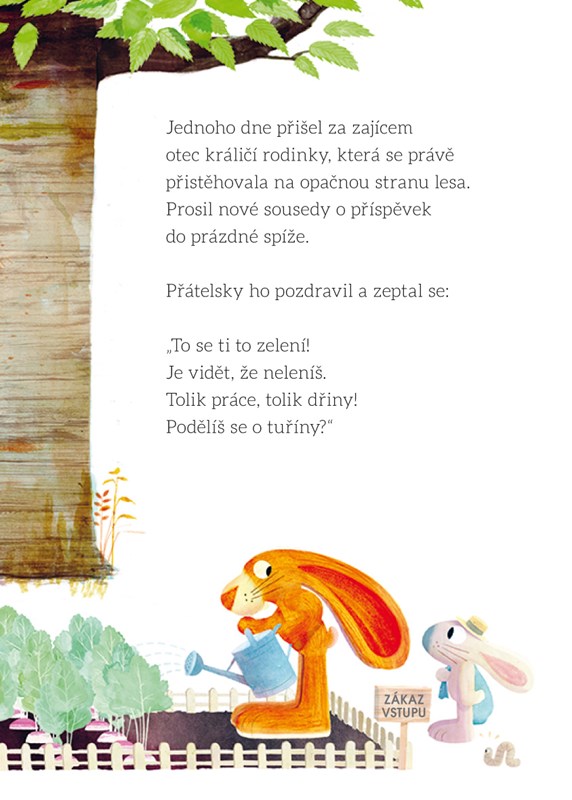 Zajíc je pyšný na svou úrodu tuřínu a nechce se o ni s nikým dělit. Jednoho dne se v sousedství zabydlí králíci a chtějí se s ním přátelit a taky dělit o úrodu, důrazně je odmítne – on si přece vystačí sám! Změní nakonec názor a najde se svými novými sousedy společnou řeč?