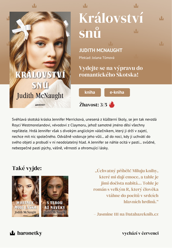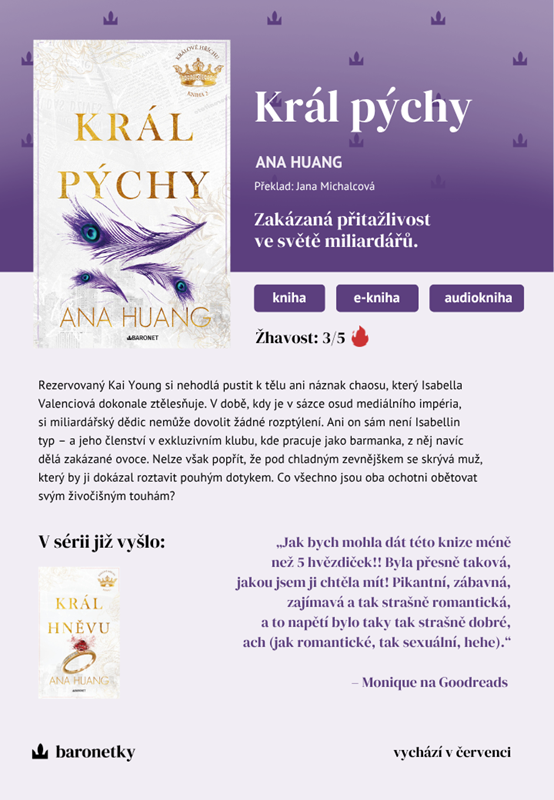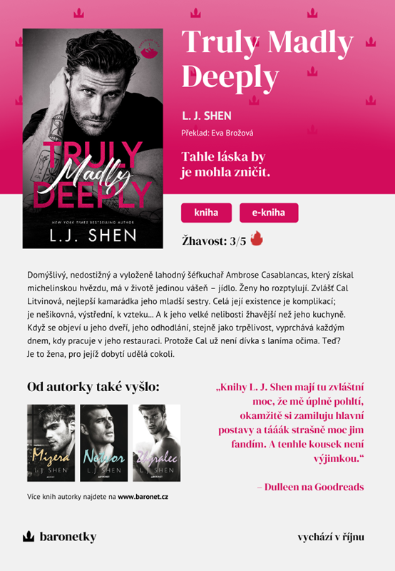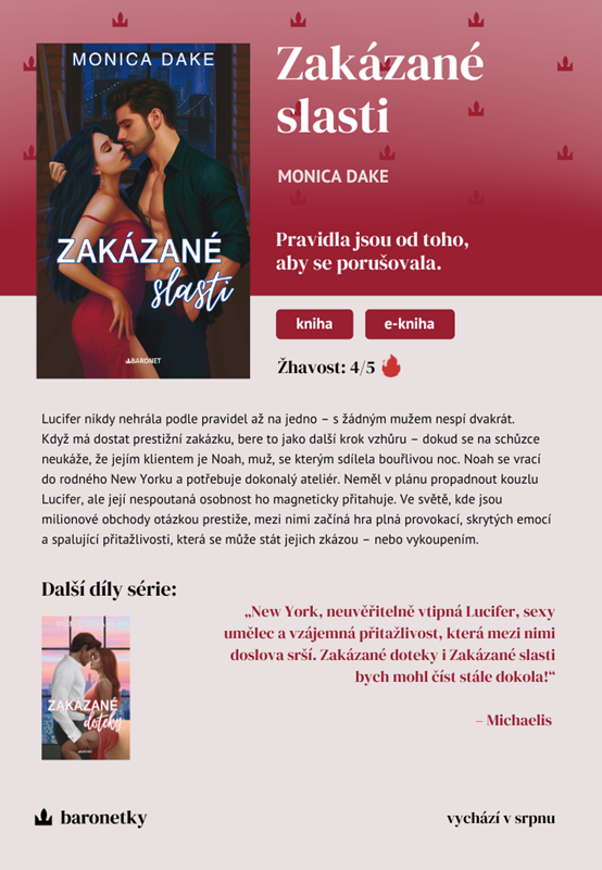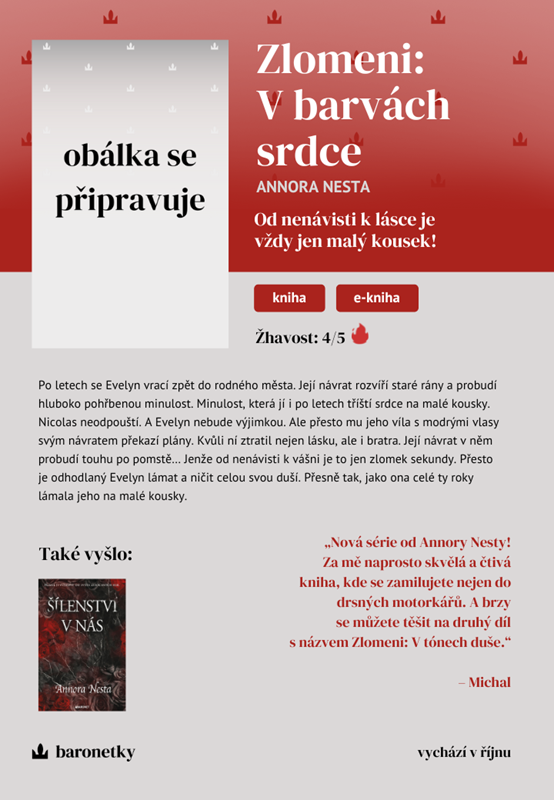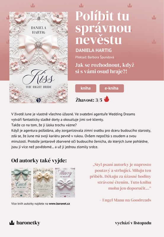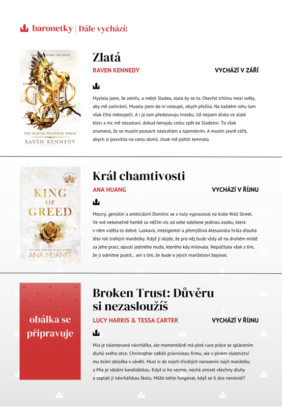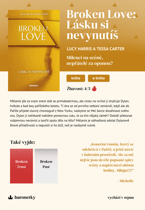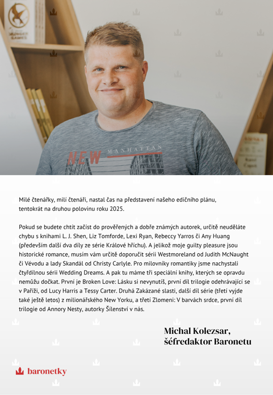 Pokud se budete chtít začíst do prověřených a dobře známých autorek, určitě neuděláte chybu s knihami L. J. Shen, Liz Tomforde, Lexi Ryan, Rebeccy Yarros či Any Huang (především další dva díly ze série Králové hříchu). A jelikož moje guilty pleasure jsou historické romance, musím vám určitě doporučit sérii Westmoreland od Judith McNaught či Vévodu a lady Skandál od Christy Carlyle. Pro milovníky romantiky jsme nachystali čtyřdílnou sérii Wedding Dreams. A pak tu máme tři speciální knihy, kterých se opravdu nemůžu dočkat. První je Broken Love: Lásku si nevynutíš, první díl trilogie odehrávající se v Paříži, od Lucy Harris a Tessy Carter. Druhá Zakázané slasti, další díl série (třetí vyjde také ještě letos) z milionářského New Yorku, a třetí Zlomeni: V barvách srdce, první díl trilogie od Annory Nesty, autorky Šílenství v nás.