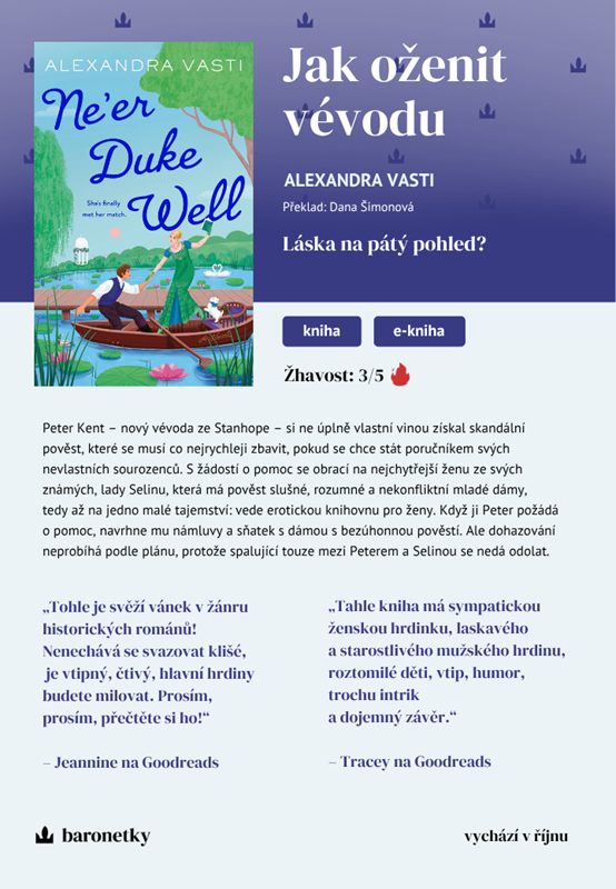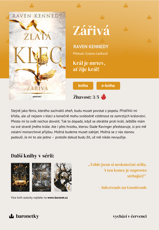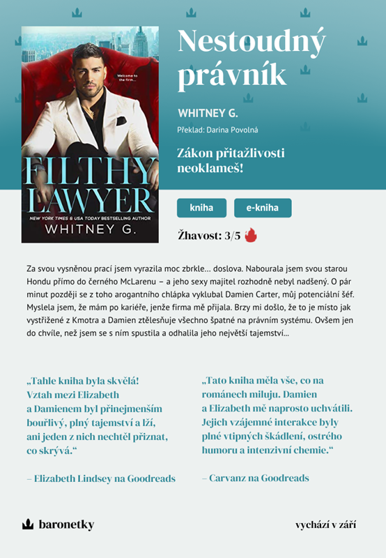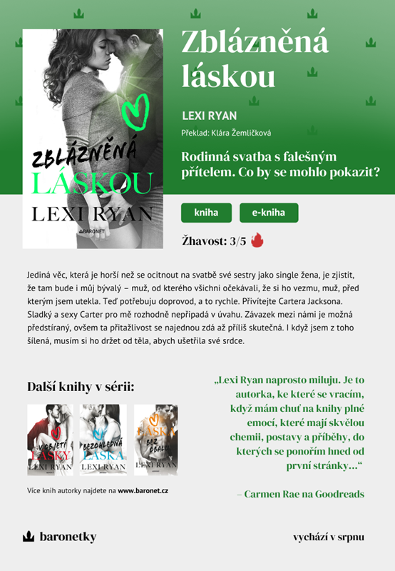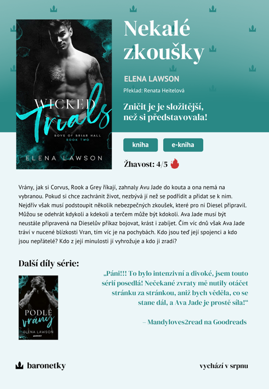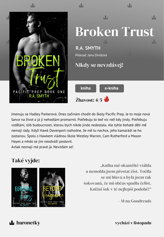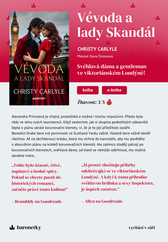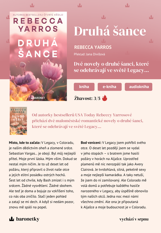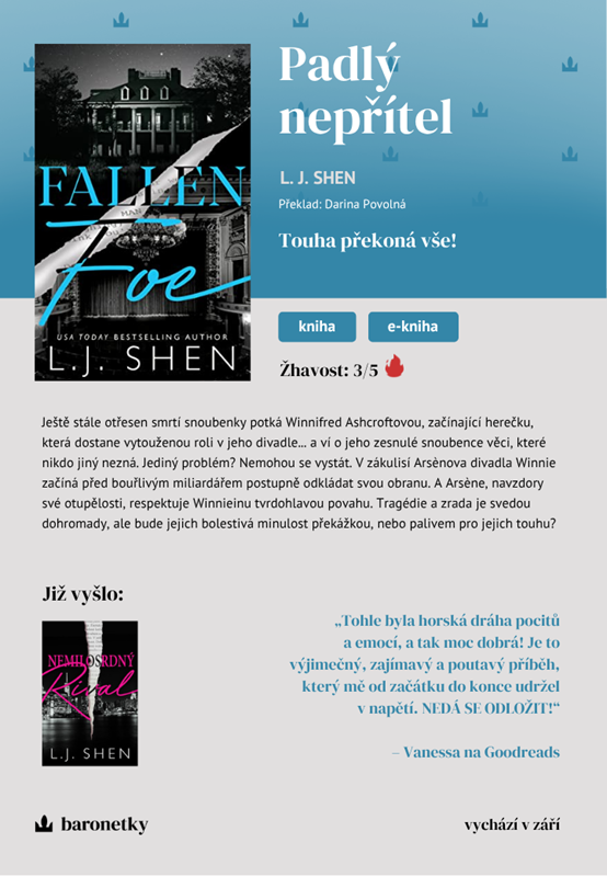 Pokud se budete chtít začíst do prověřených a dobře známých autorek, určitě neuděláte chybu s knihami L. J. Shen, Liz Tomforde, Lexi Ryan, Rebeccy Yarros či Any Huang (především další dva díly ze série Králové hříchu). A jelikož moje guilty pleasure jsou historické romance, musím vám určitě doporučit sérii Westmoreland od Judith McNaught či Vévodu a lady Skandál od Christy Carlyle. Pro milovníky romantiky jsme nachystali čtyřdílnou sérii Wedding Dreams. A pak tu máme tři speciální knihy, kterých se opravdu nemůžu dočkat. První je Broken Love: Lásku si nevynutíš, první díl trilogie odehrávající se v Paříži, od Lucy Harris a Tessy Carter. Druhá Zakázané slasti, další díl série (třetí vyjde také ještě letos) z milionářského New Yorku, a třetí Zlomeni: V barvách srdce, první díl trilogie od Annory Nesty, autorky Šílenství v nás.